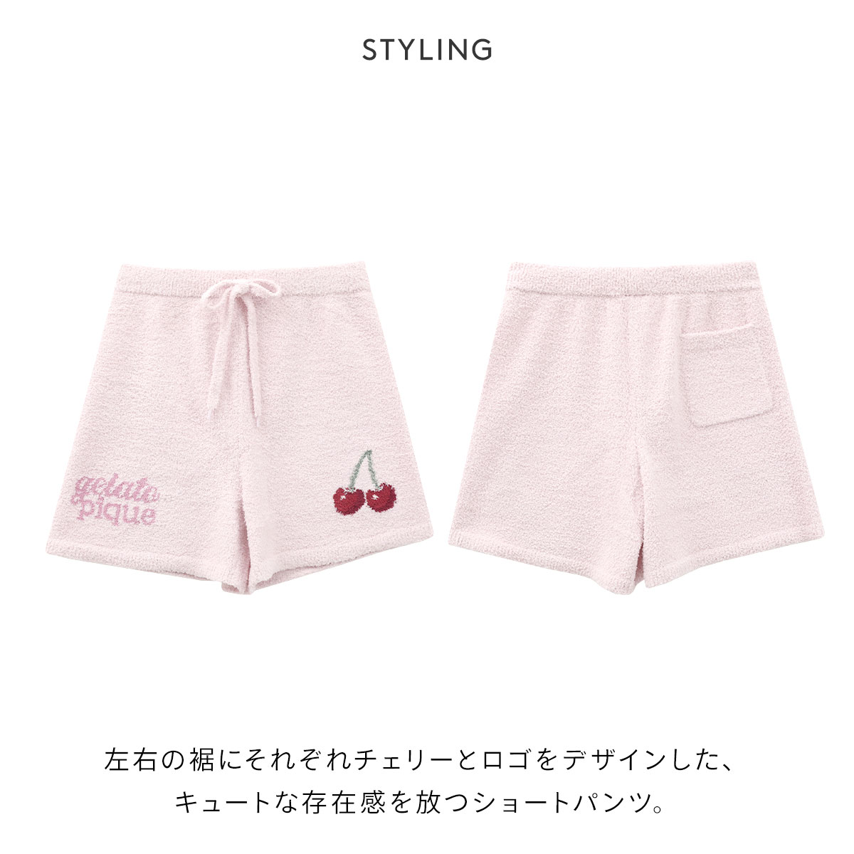 左右の裾にそれぞれチェリーとロゴをデザインした、キュートな存在感を放つショートパンツ。