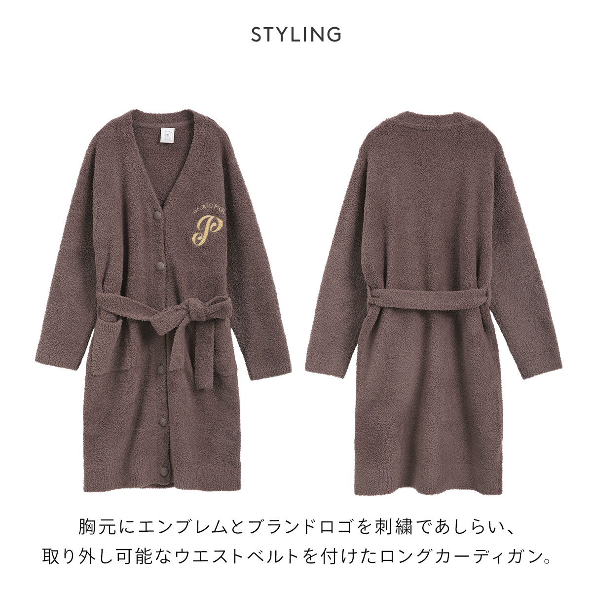 こちらは、胸元にエンブレムとブランドロゴを刺繍であしらい、取り外し可能なウエストベルトを付けたロングカーディガンです。