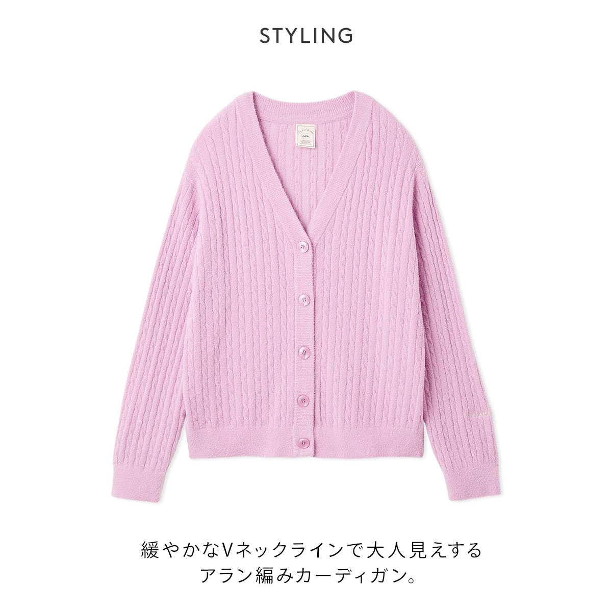 緩やかなVネックラインで大人見えするアラン編みカーディガン。