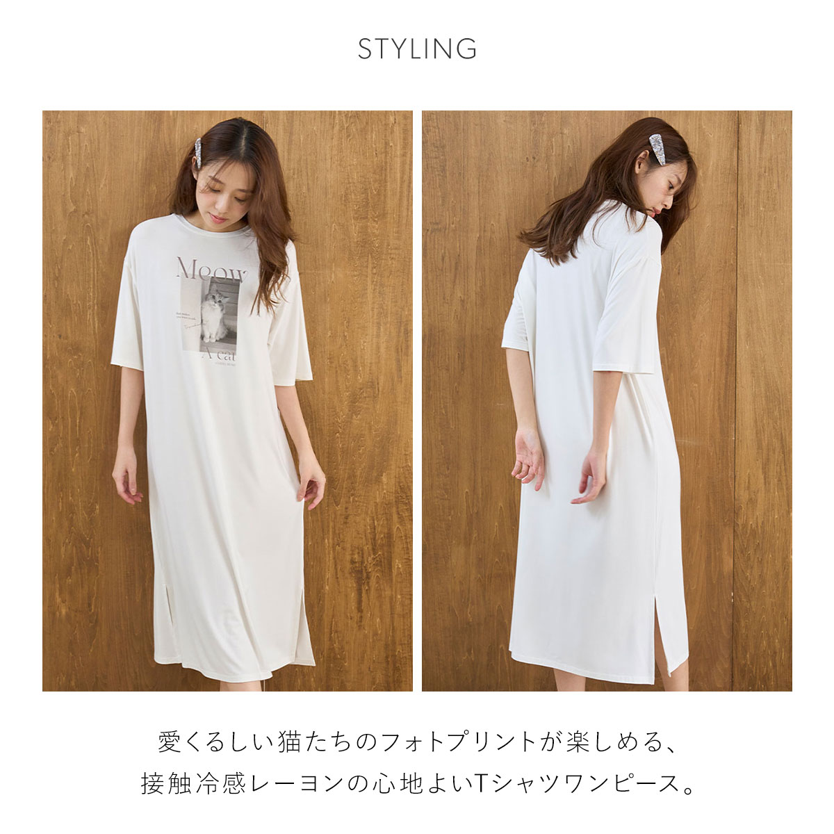 愛くるしい猫たちのフォトプリントが楽しめる、接触冷感レーヨンの心地よいTシャツワンピースです。