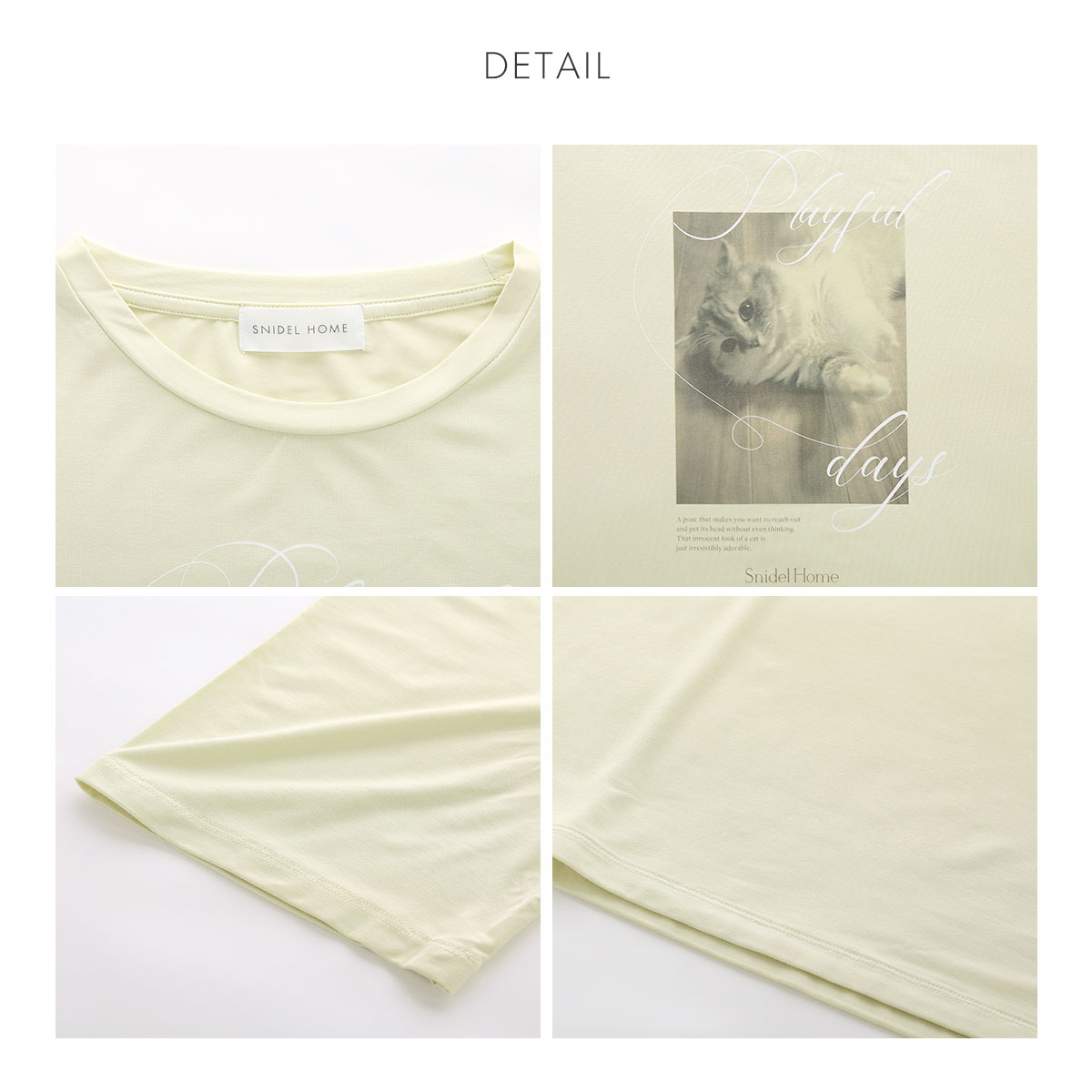 主の帰りを待つ表情、すやすや眠る姿、「遊ぼう!」と誘うポーズなど、猫の可愛い瞬間をプリントに閉じ込めました。色ごとに異なるプリントが入ったホワイト、グリーン、ピンクの3色展開です。