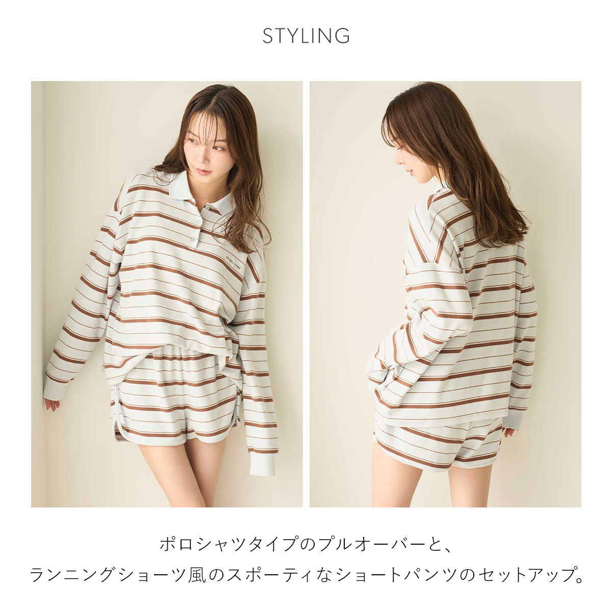 襟元と袖口のリブを無地で仕上げたポロシャツタイプのプルオーバーと、ランニングショーツ風のスポーティなショートパンツの組み合わせです。
