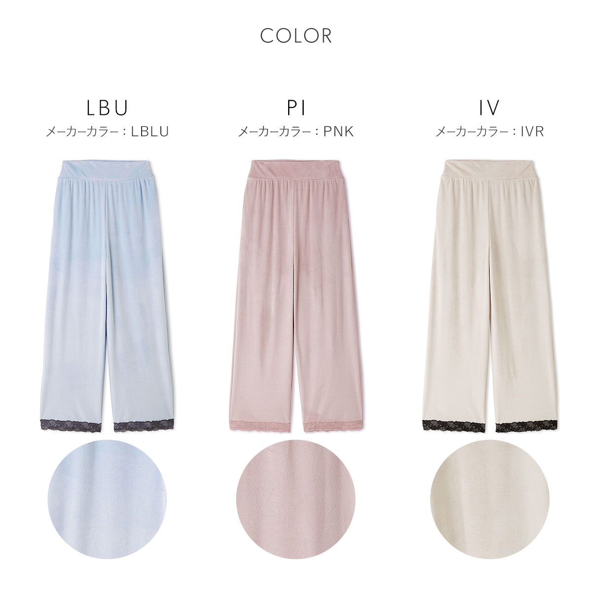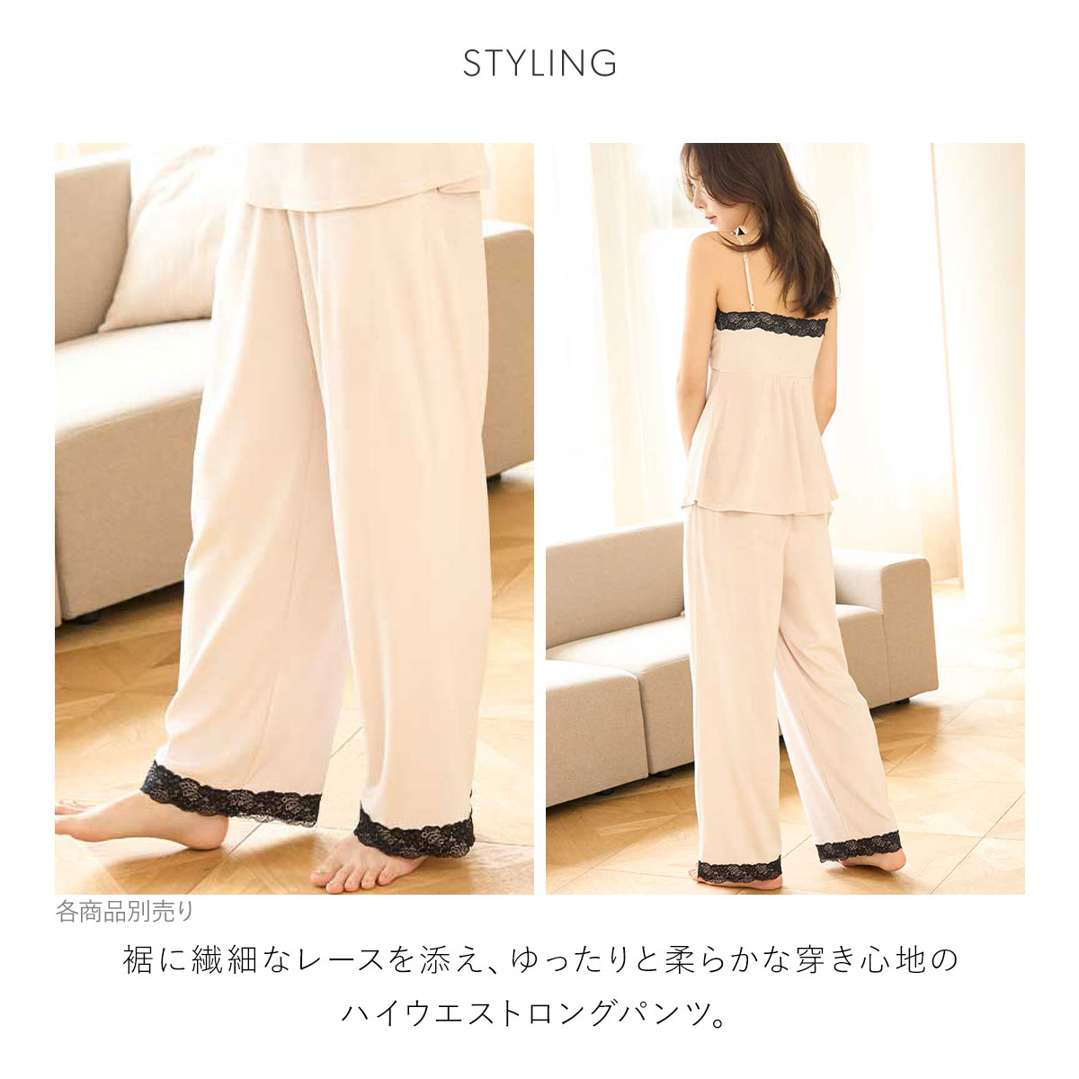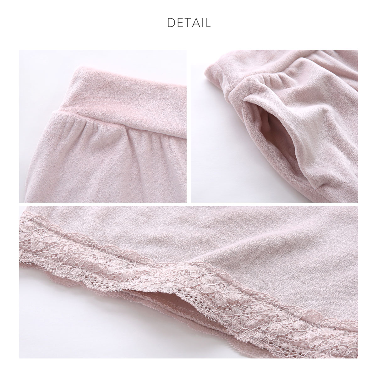 裾に繊細なレースを添え、ゆったりと柔らかな穿き心地。両脇にポケットが付いています。幅広のウエストは、秋口からの冷え対策としても重宝します。
