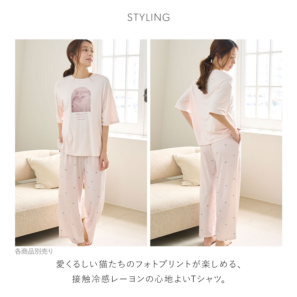 主の帰りを待つ表情、すやすや眠る姿、「遊ぼう!」と誘うポーズなど、猫の可愛い瞬間をフォトプリントに閉じ込めました。色ごとに異なるプリントが入ったホワイト、グリーン、ピンクの3色展開。同シリーズのロングパンツ(B52SHCP254051)と合わせたり、猫好きさんへのギフトにもおすすめです。