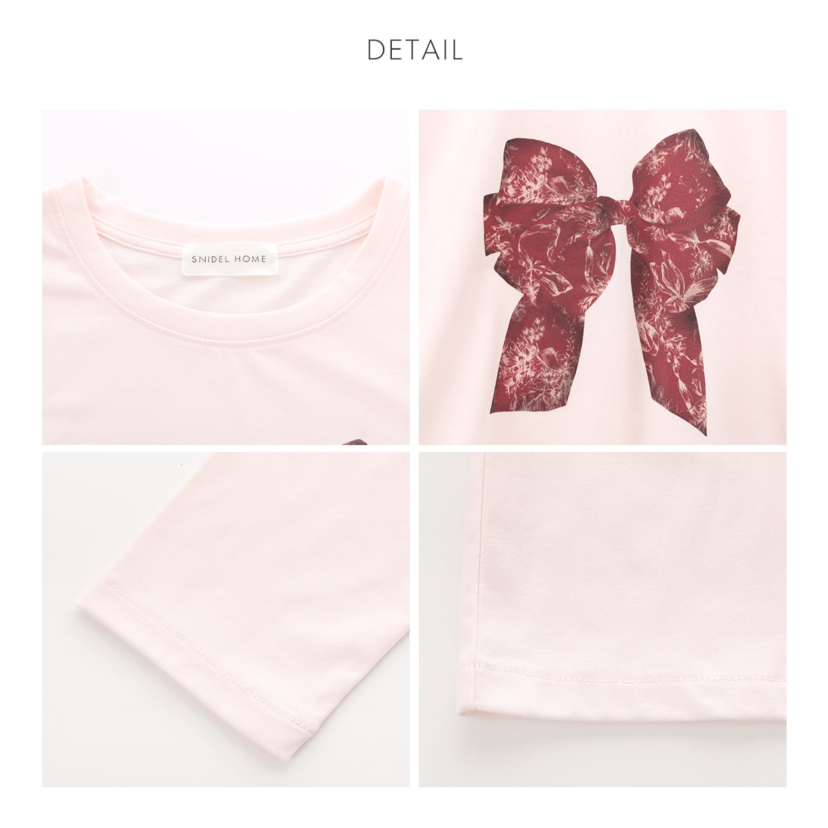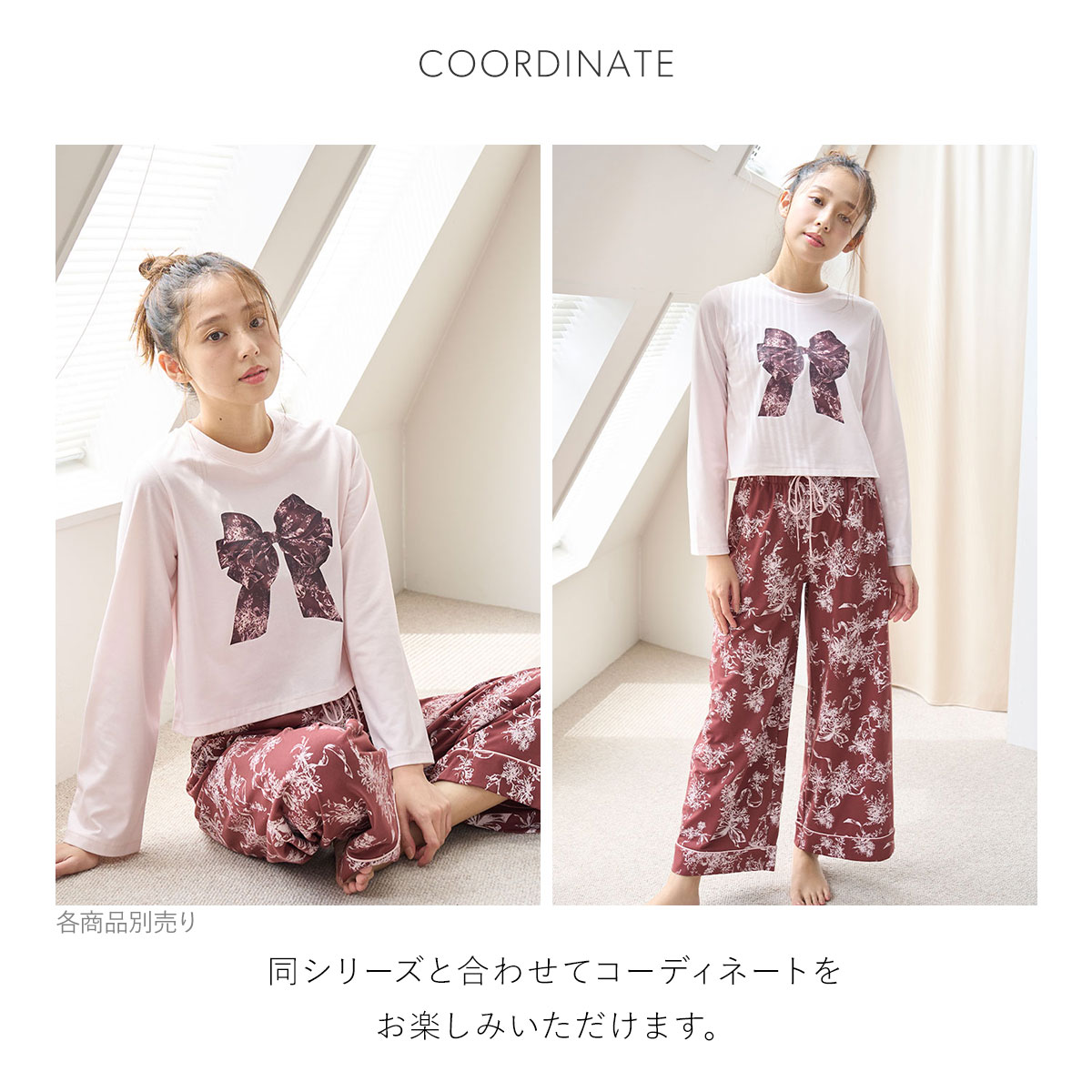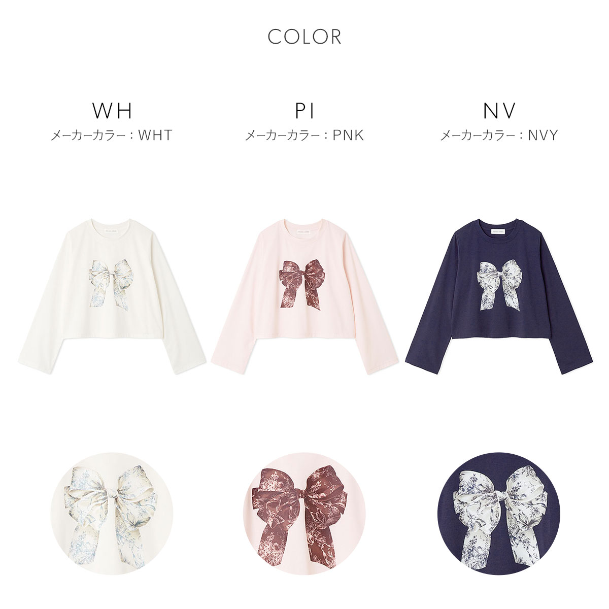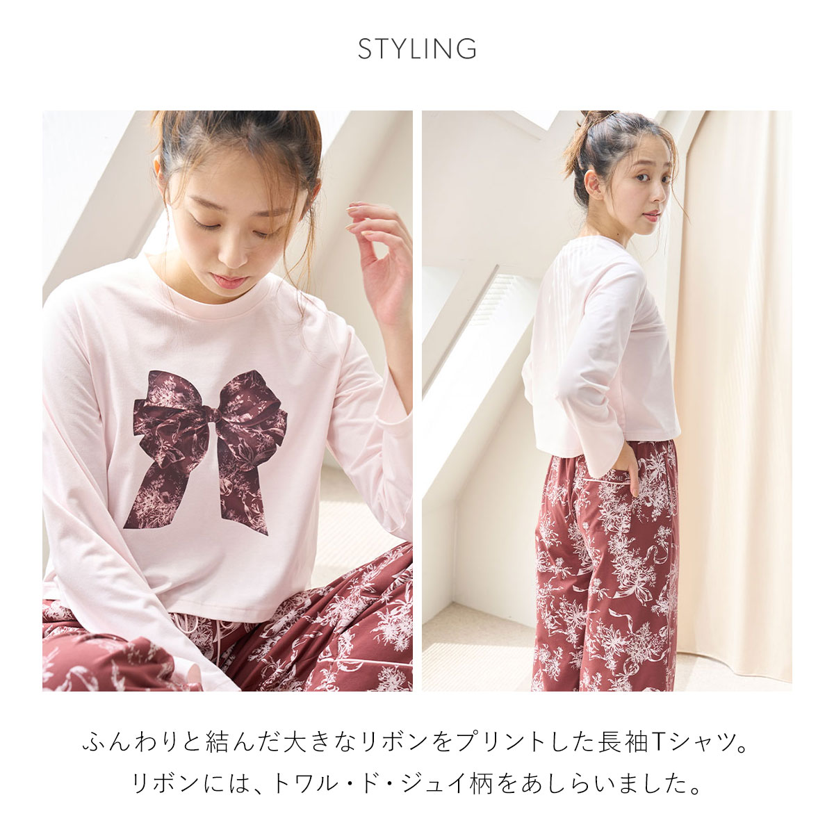 なめらかなカットソーに、ふんわりと結んだ大きなリボンをプリントした長袖Tシャツです。リボンには、今シーズン人気のトワル・ド・ジュイ柄をあしらいました。