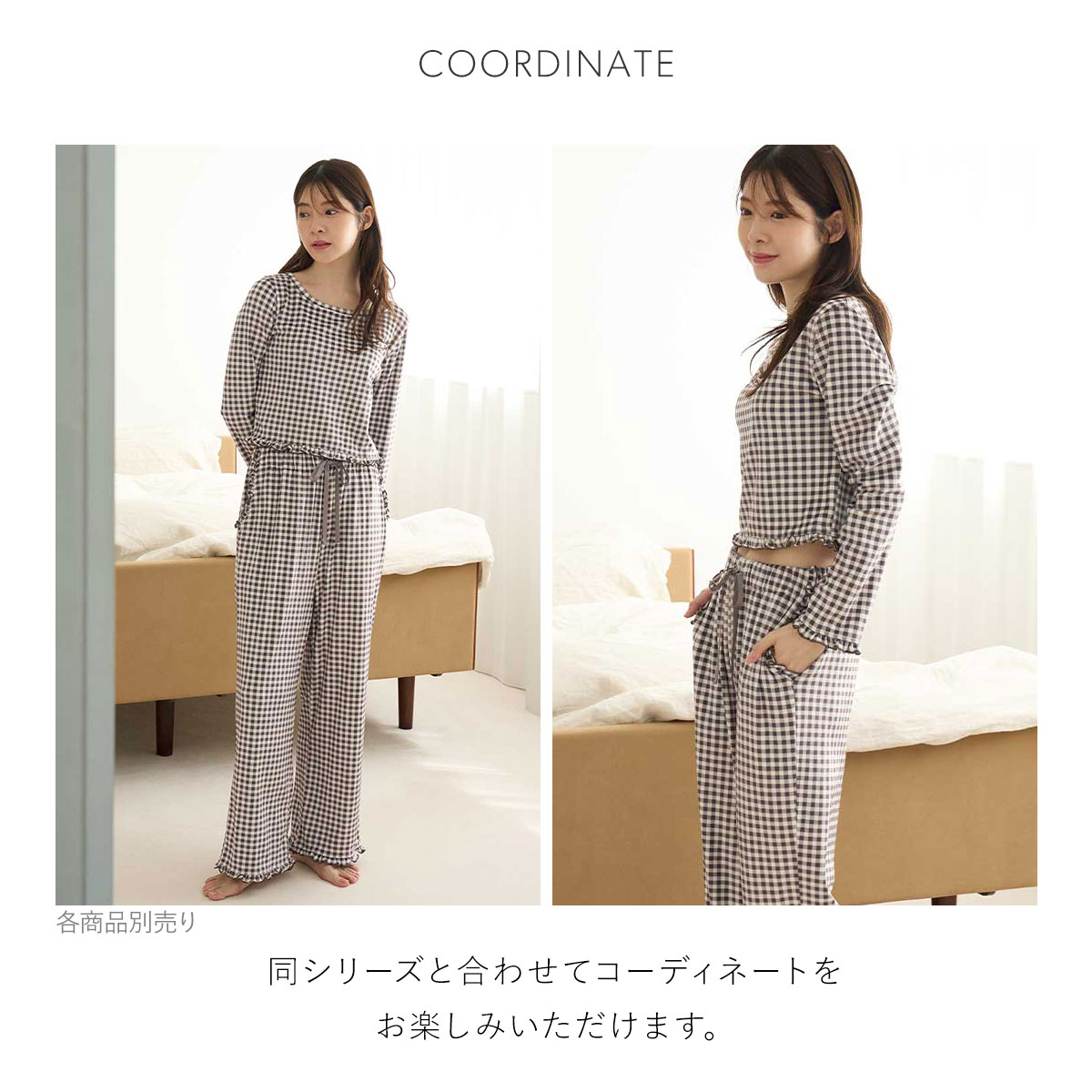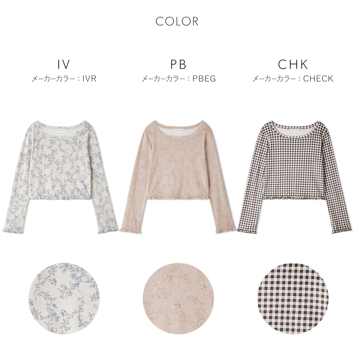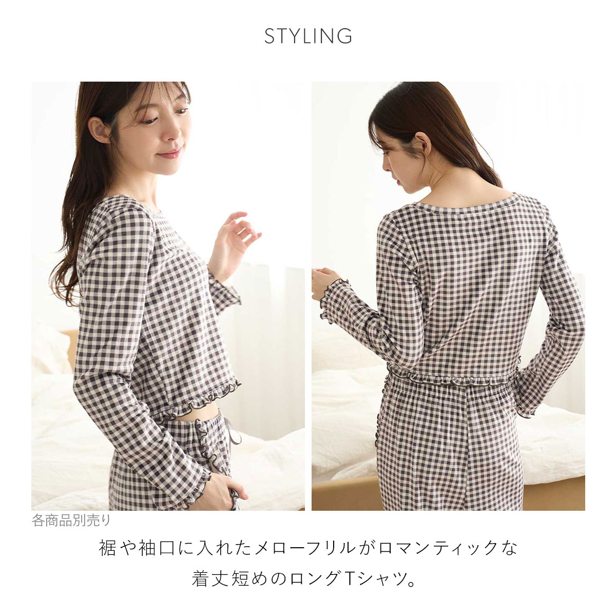 こちらは、裾や袖口に入れたメローフリルがロマンティックなロングTシャツです。