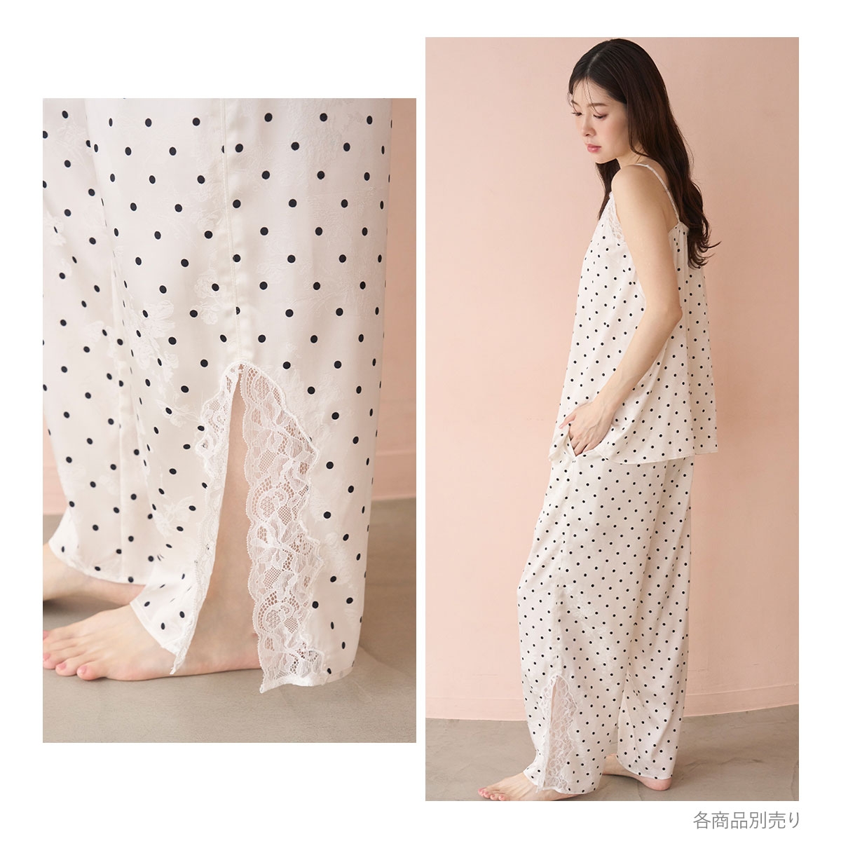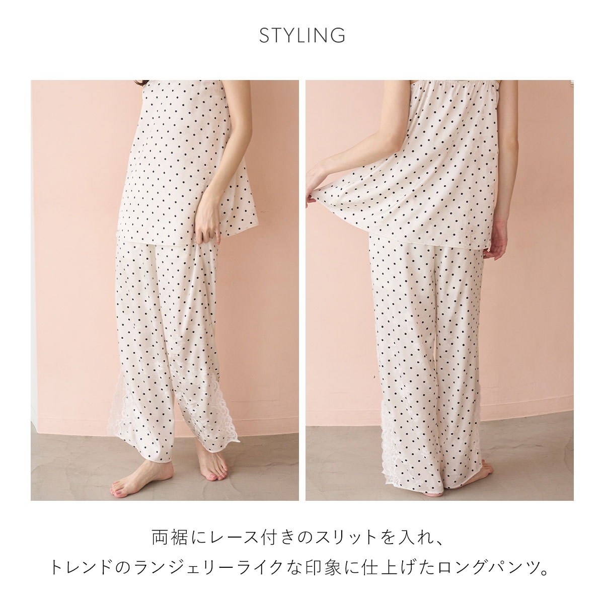 こちらは、両裾にレース付きのスリットを入れ、トレンドのランジェリーライクな印象に仕上げたロングパンツです。