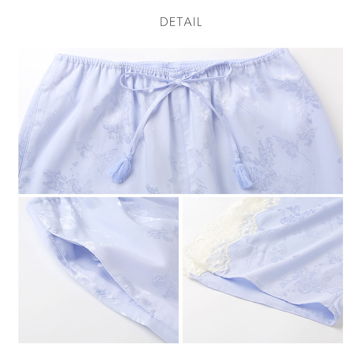 ウエストのピコレースやタッセルのウエスト紐でさりげなく華やかさをプラスています。