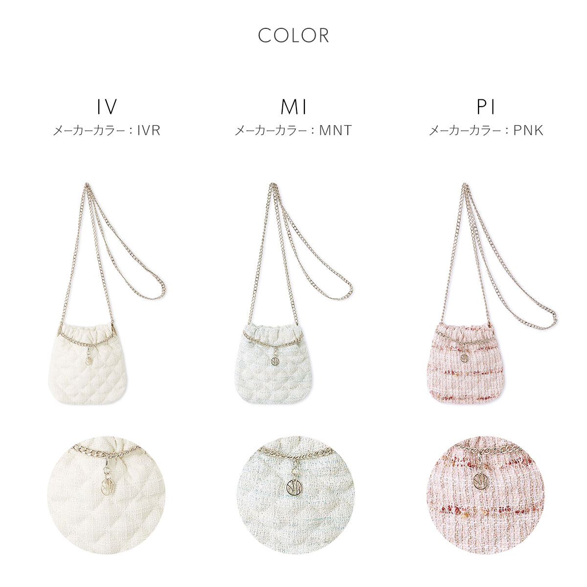| カラー | IV-アイボリー、MI-ミント、PI-ピンク |