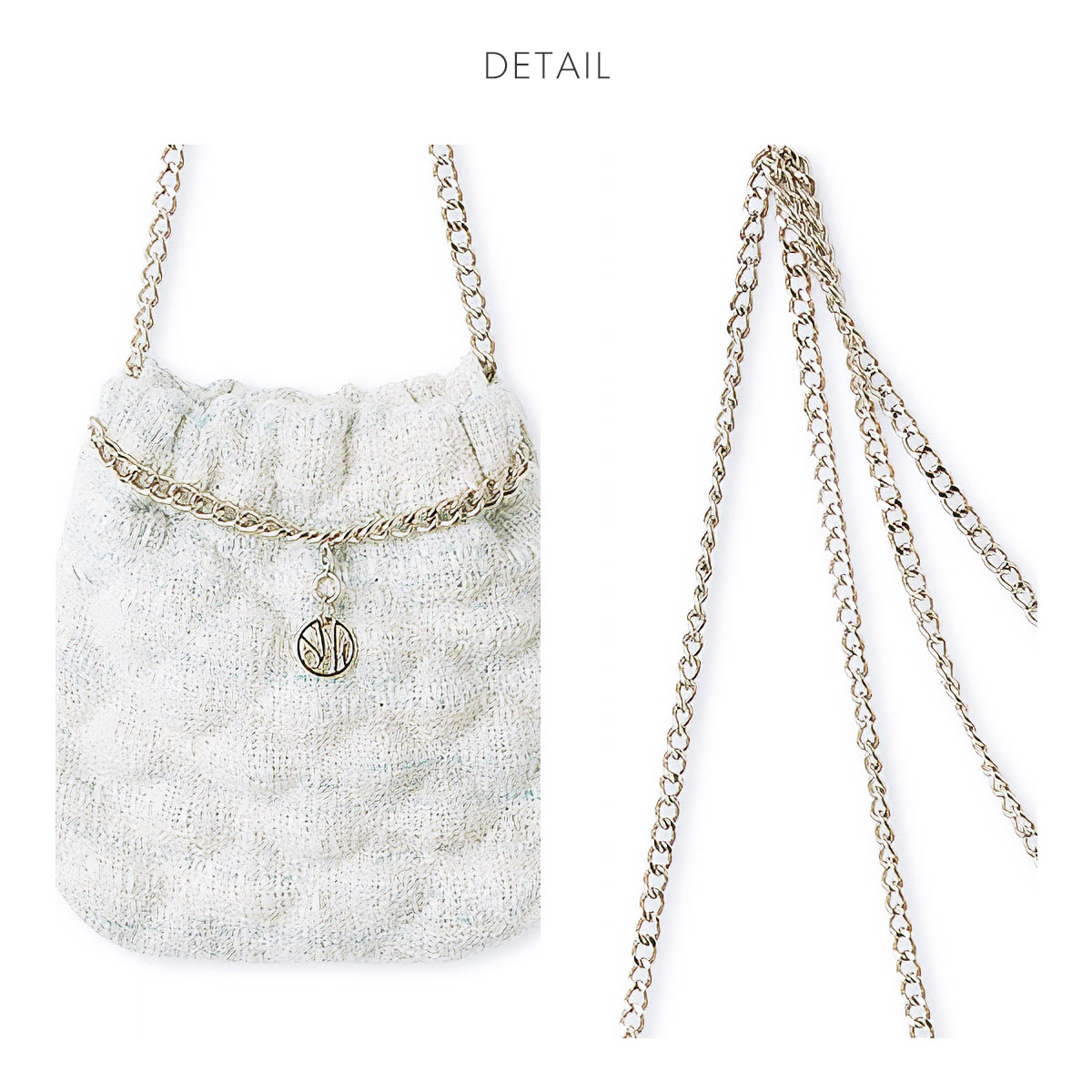 きらきら光るラメ糸を編み込んだツイード素材と、小さなチャーム付きのチェーンの国合わせが、フェミニンかつハッピーな気分を演出します。