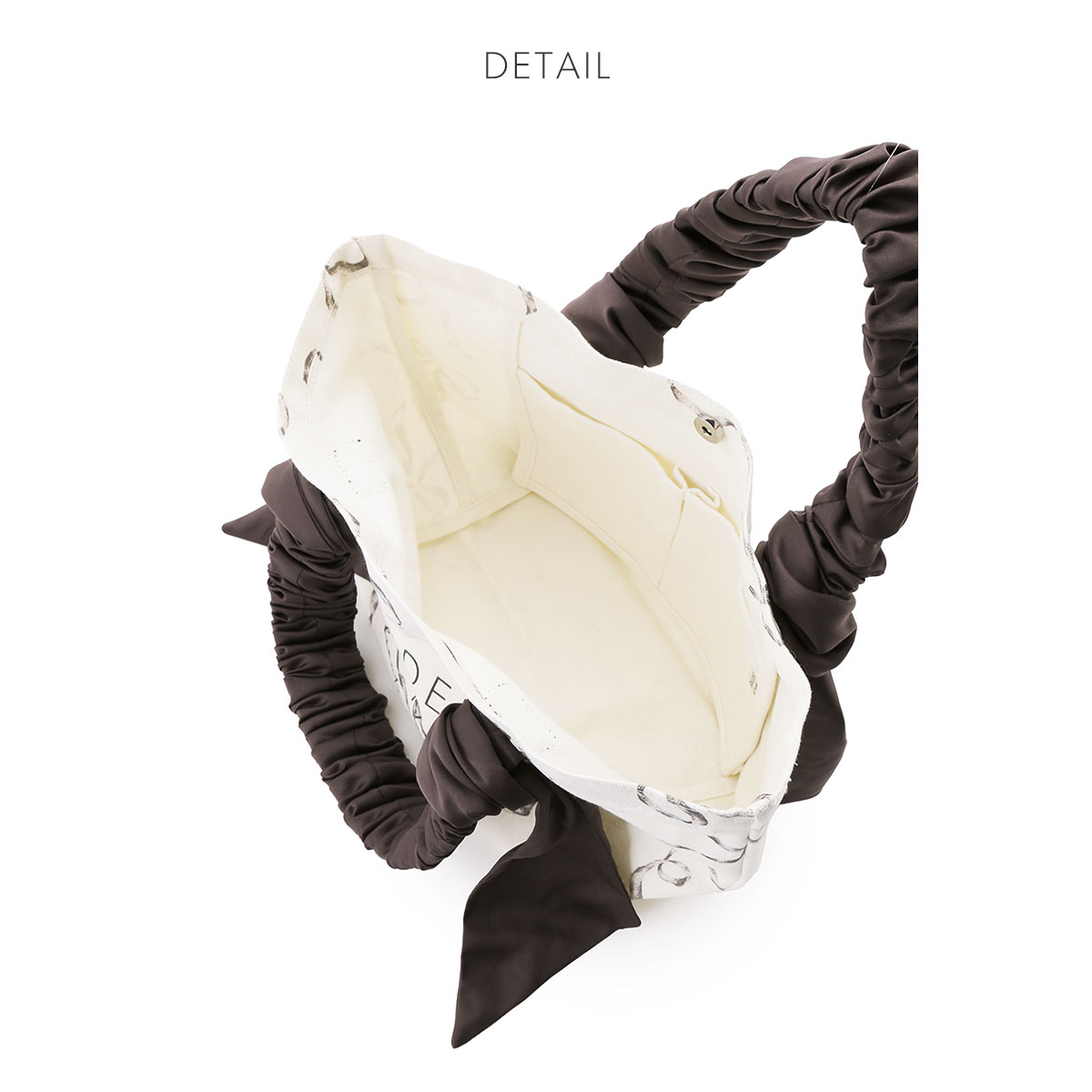 ギャザーを寄せた持ち手や大きなリボンで個性を出したおなじみのデザインに、上品な華やかさのある総柄プリントを施しています。