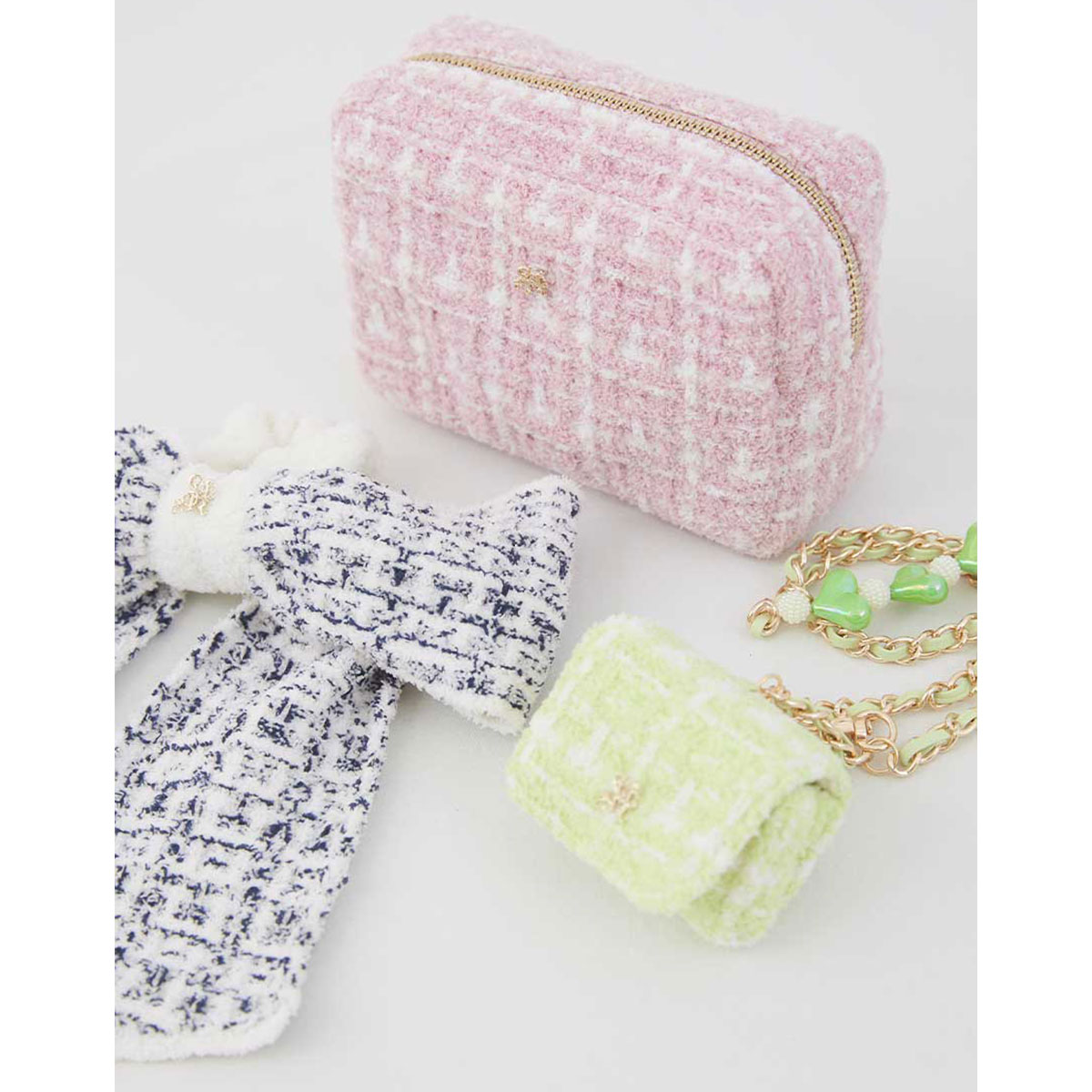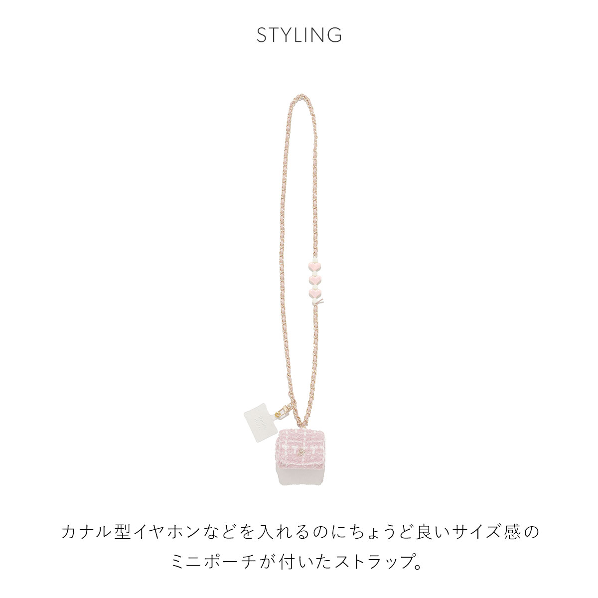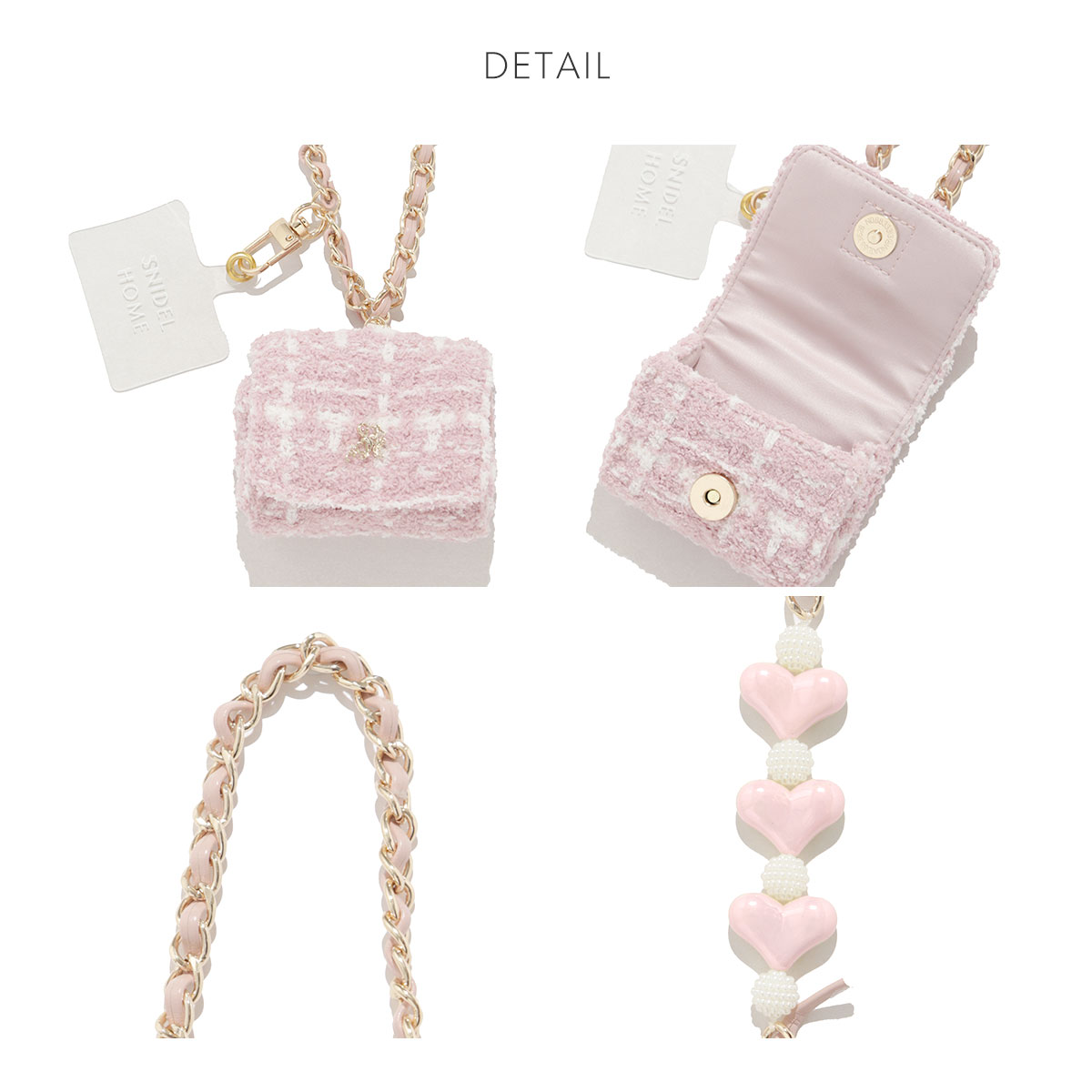 チェーンストラップにはポーチと同様のニット生地を組み合わせて、ハートのチャームやスマホを装着できるロゴ入りのタブを添えています。
