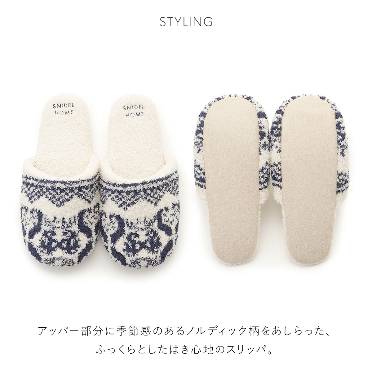 こちらは、アッパーの部分に季節感のあるノルディック柄をあしらった、ふっくらとしたはき心地のスリッパです。
