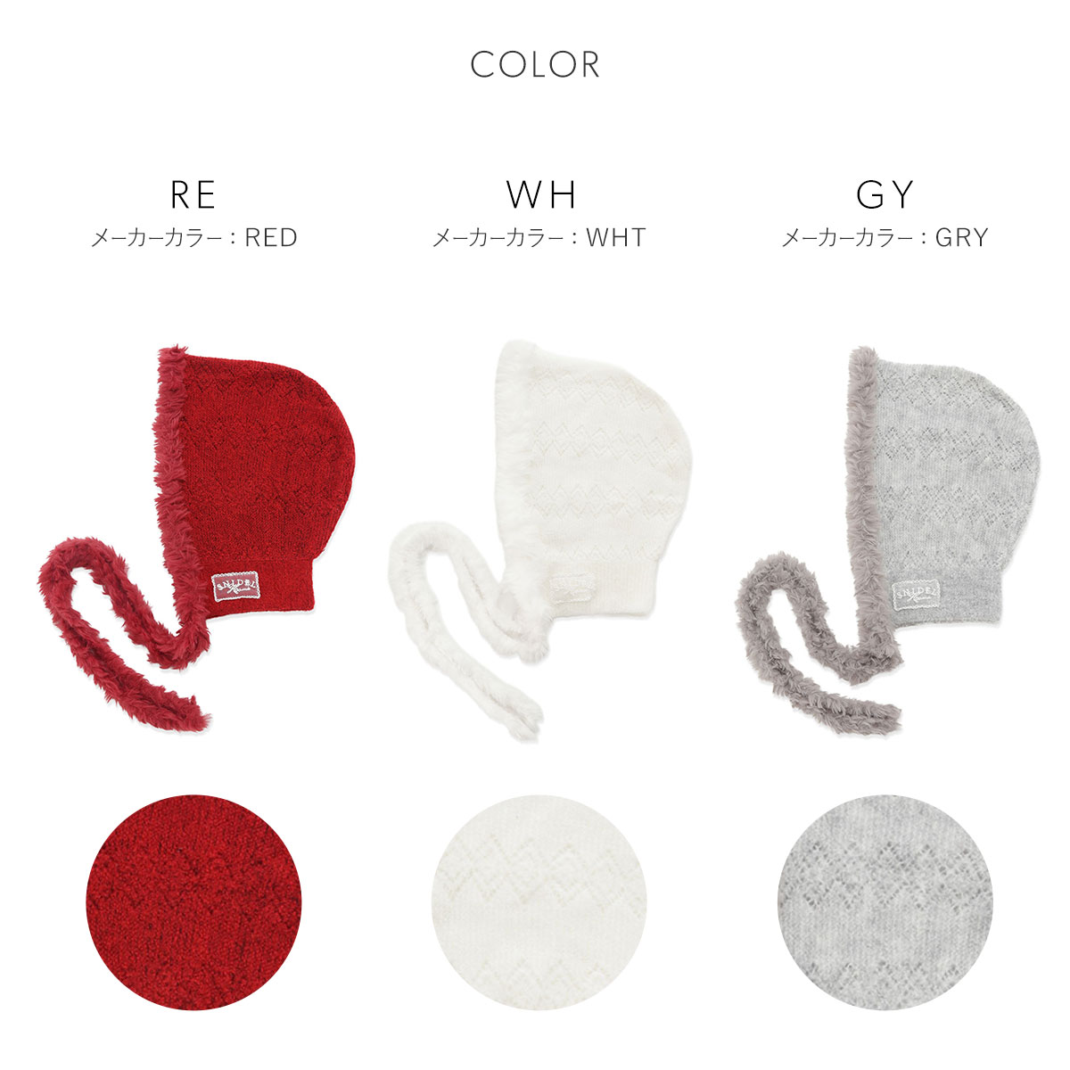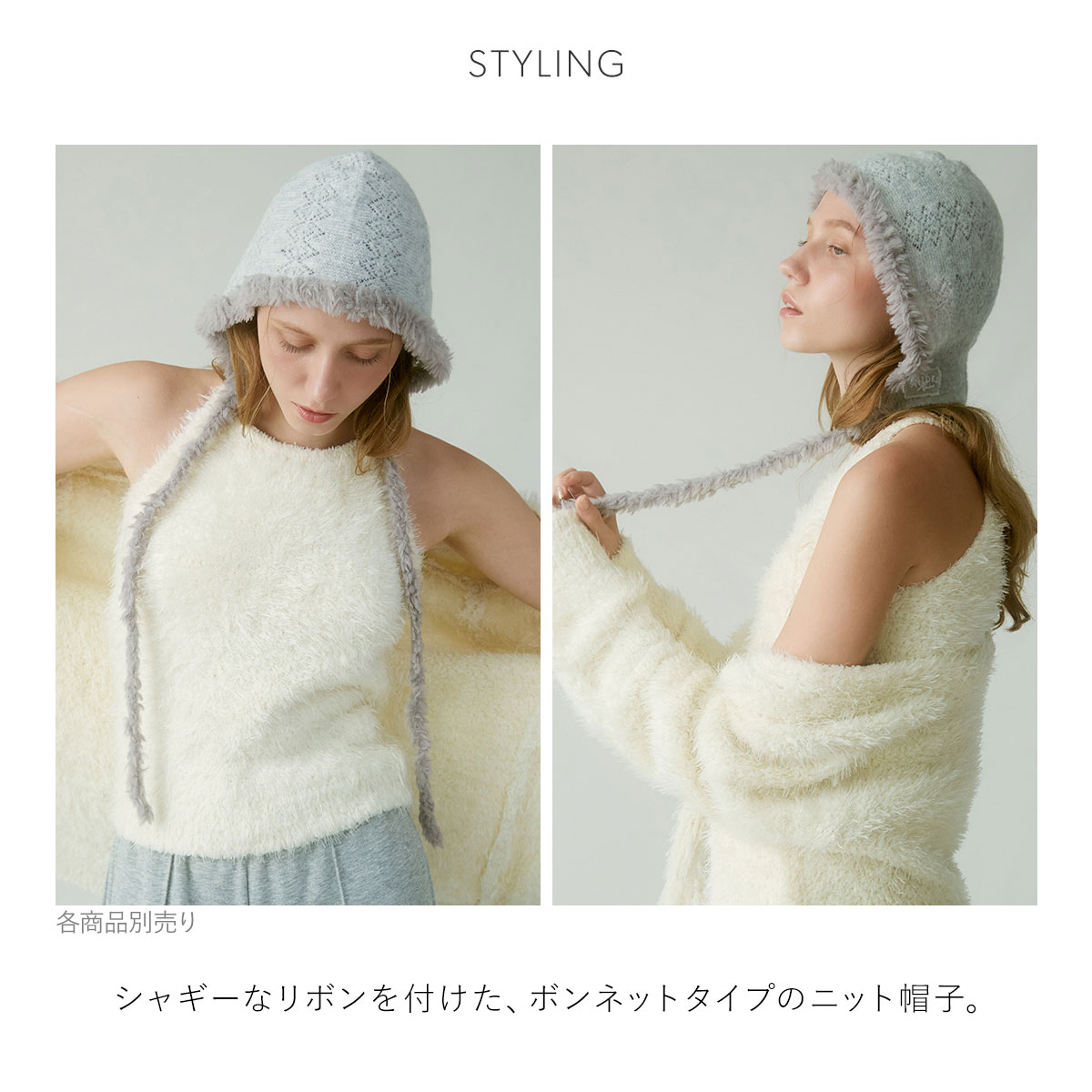こちらは、シャギーなリボンを付けた、ボンネットタイプのニット帽子です。