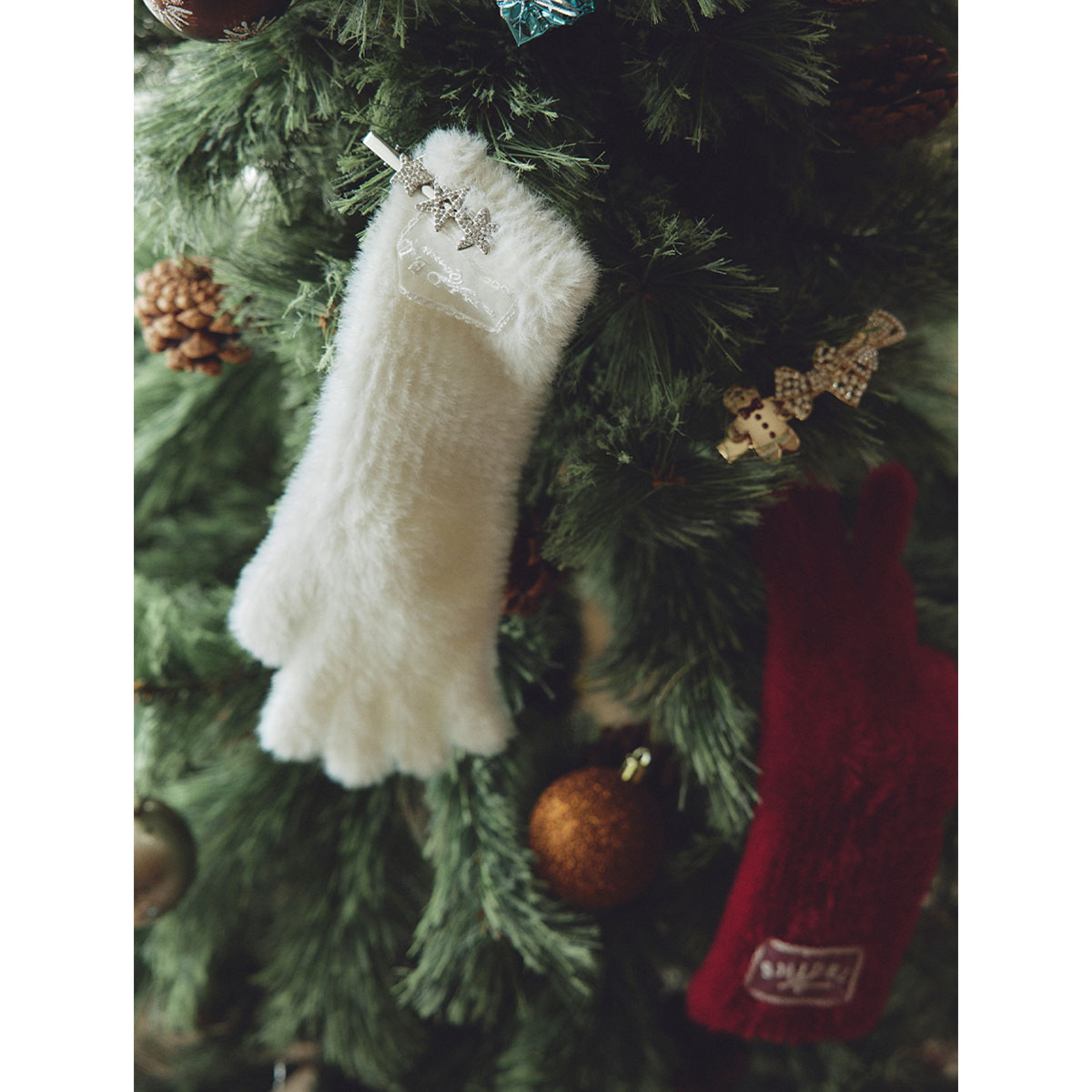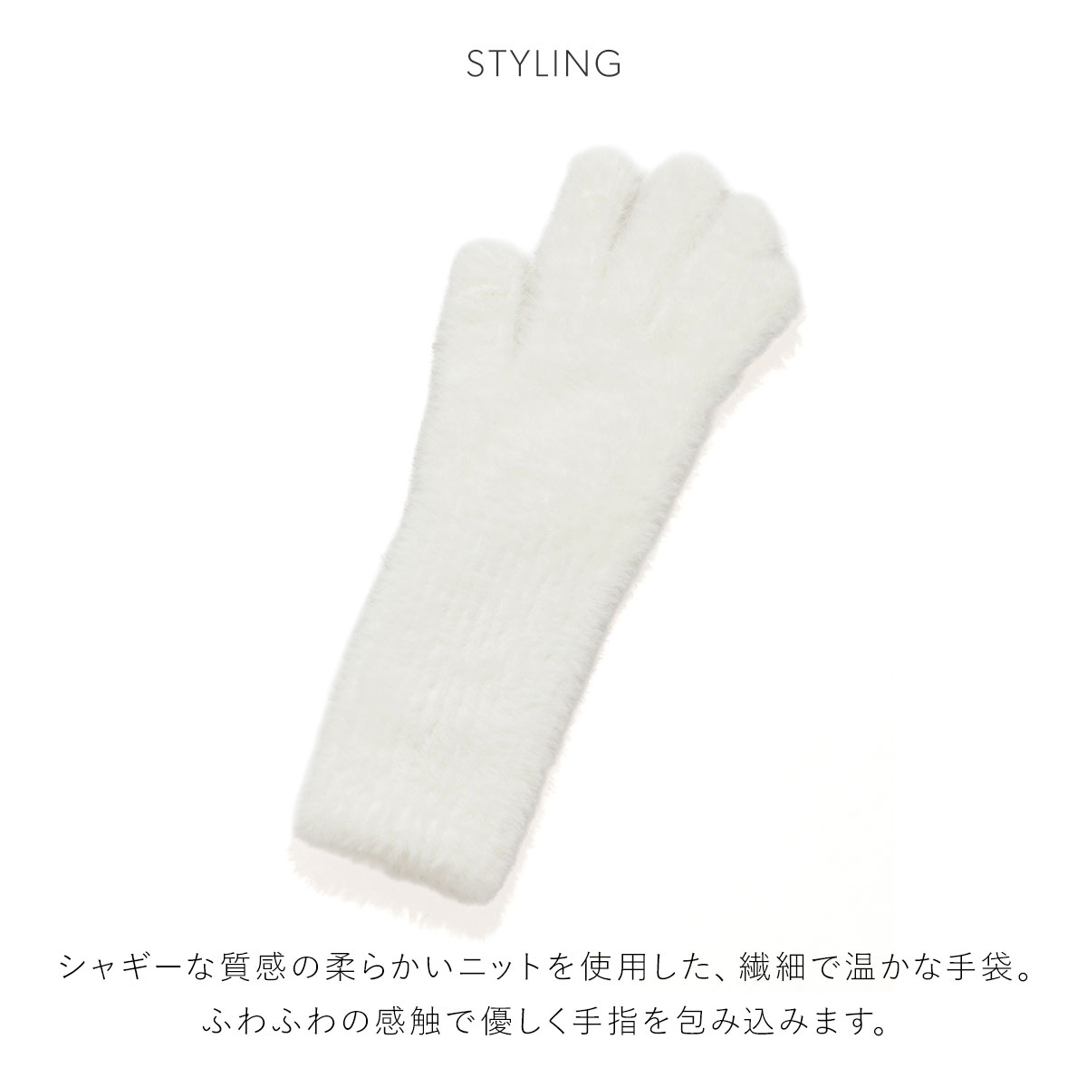 シャギーな質感の柔らかいニットを使用した、繊細で温かな手袋。ふわふわの感触で優しく手指を包み込みます。
