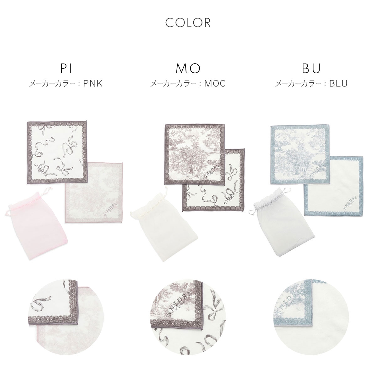 ラインナップは全3色で、モカとピンクはリボン柄とトワル・ド・ジュイ柄の2枚、ブルーはトワル・ド・ジュイ柄と無地の2枚の組み合わせです。