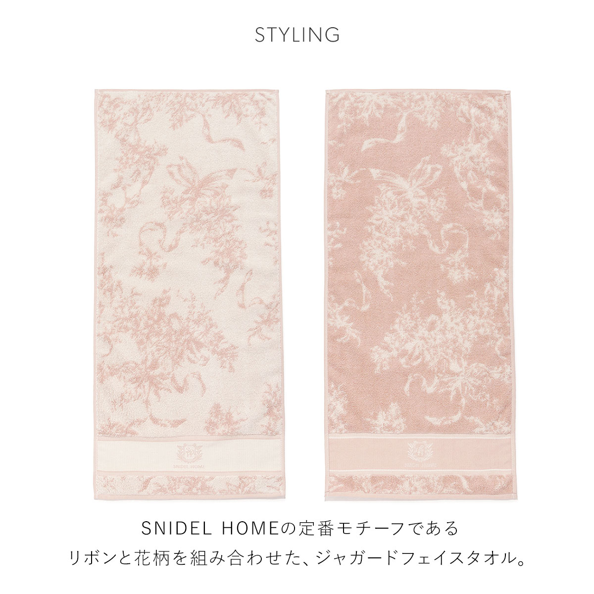 SNIDEL HOMEの定番モチーフであるリボンと花柄を組み合わせた、コットン100%の柔らかなジャガードフェイスタオル。