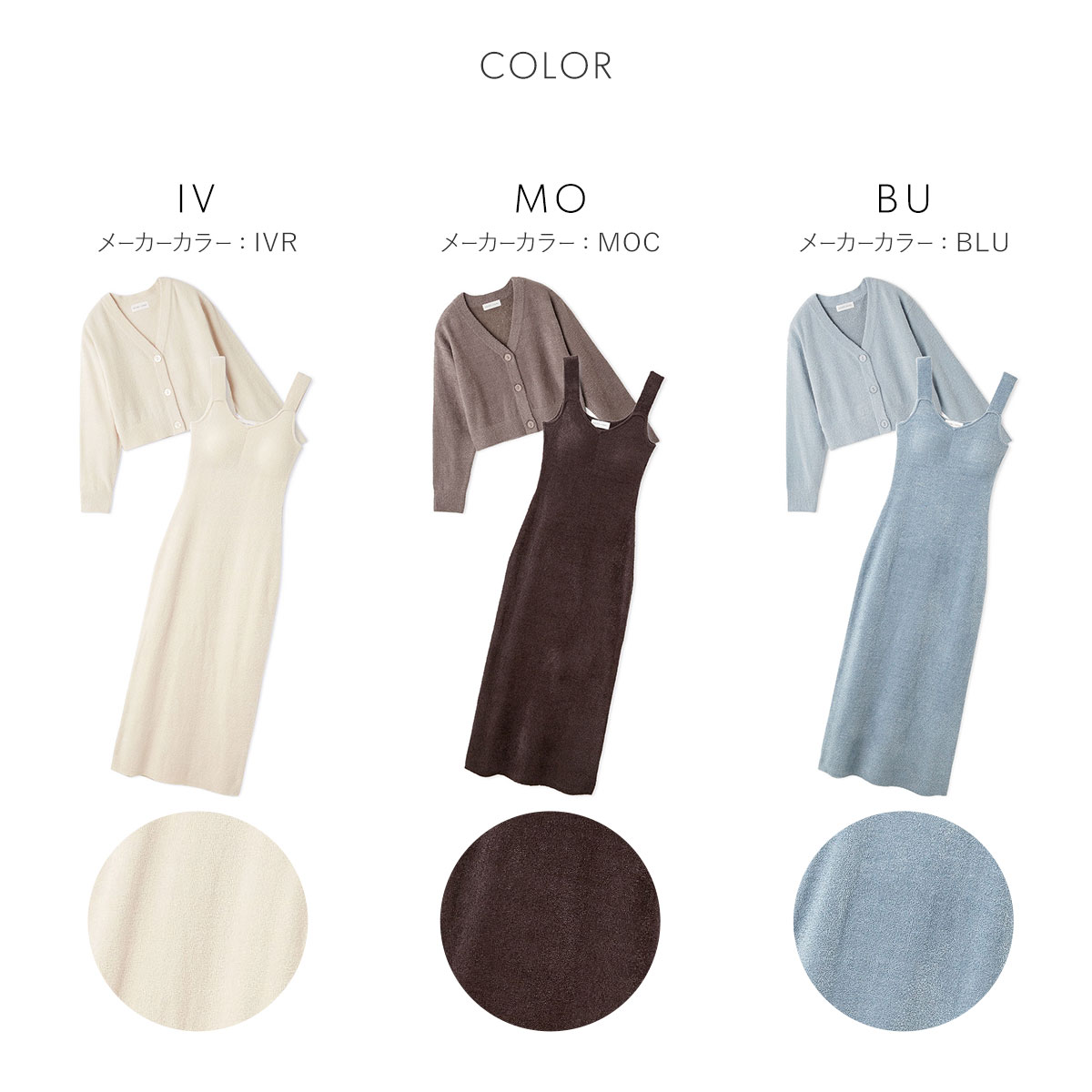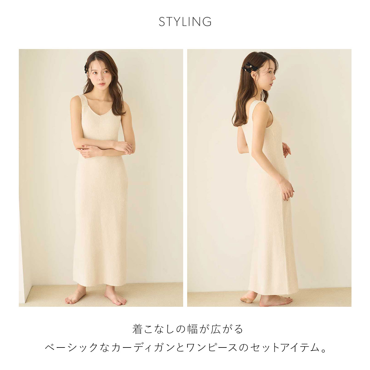 なめらかな肌触りのニットを使用した、ベーシックなカーディガンとワンピースのセットアイテム。