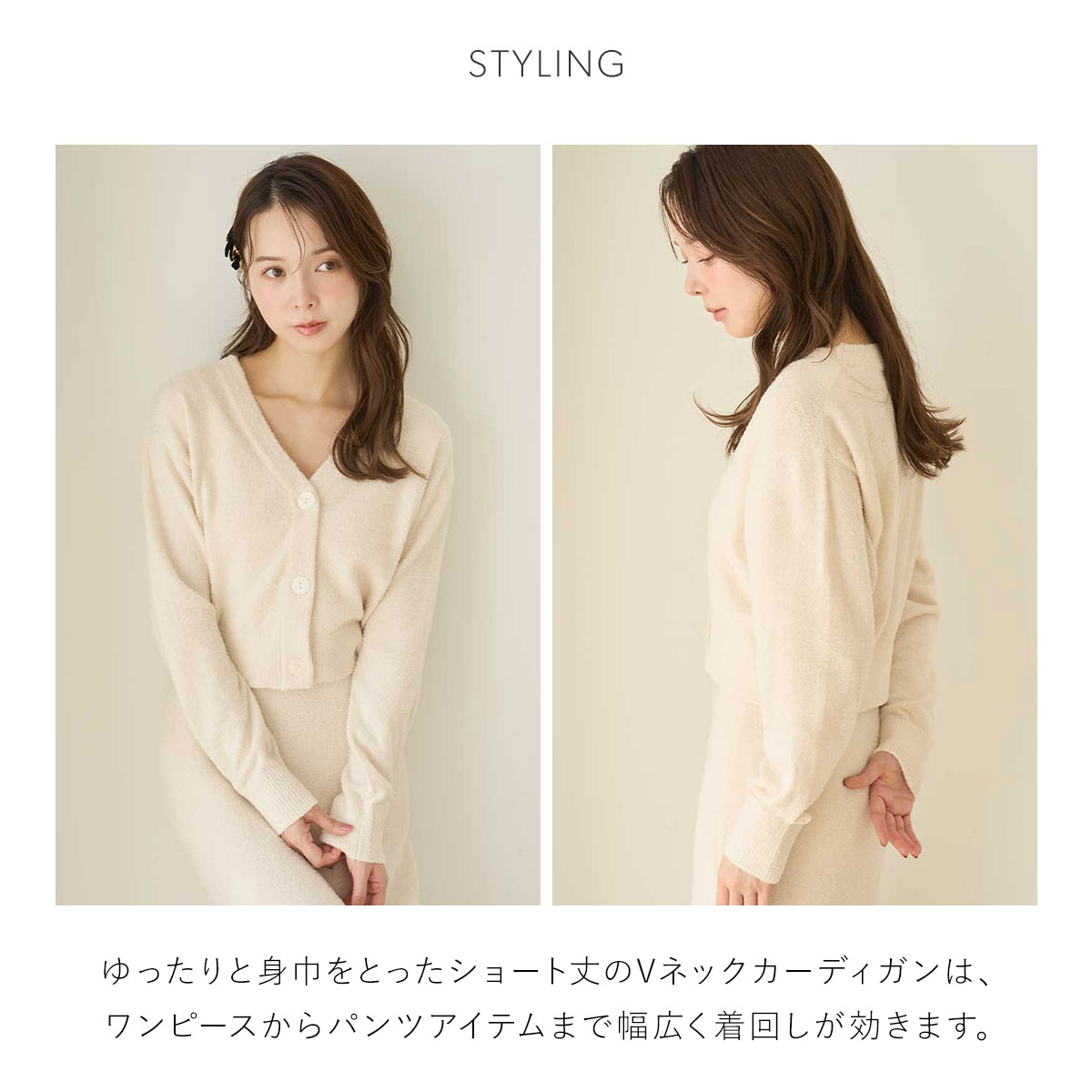 ゆったりと身巾をとったショート丈のVネックカーディガンは、ワンピースからパンツアイテムまで幅広く着回しが効きます。