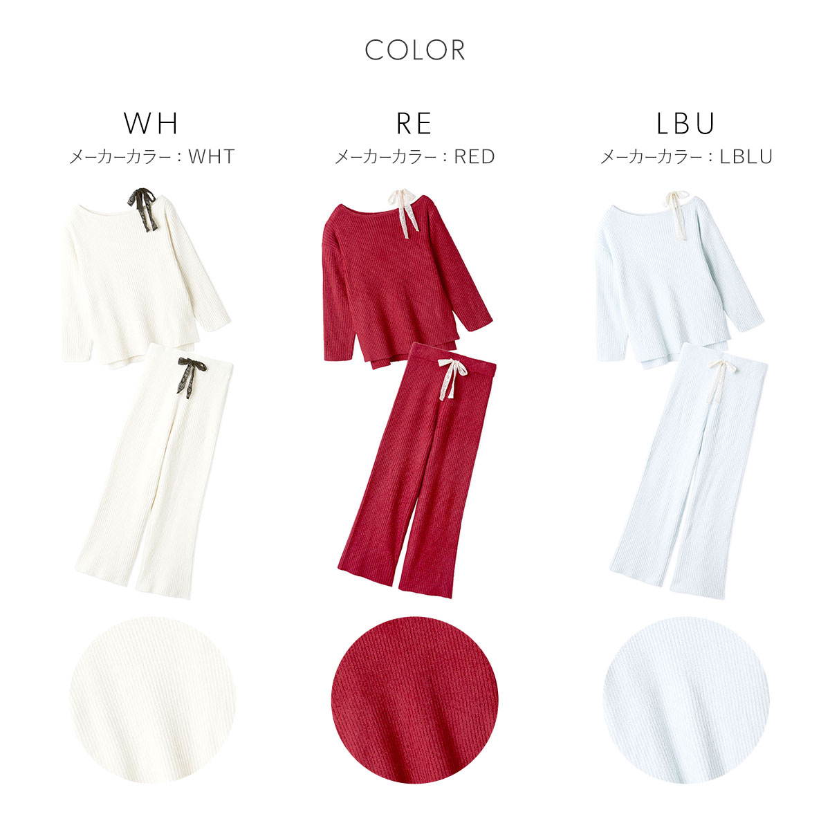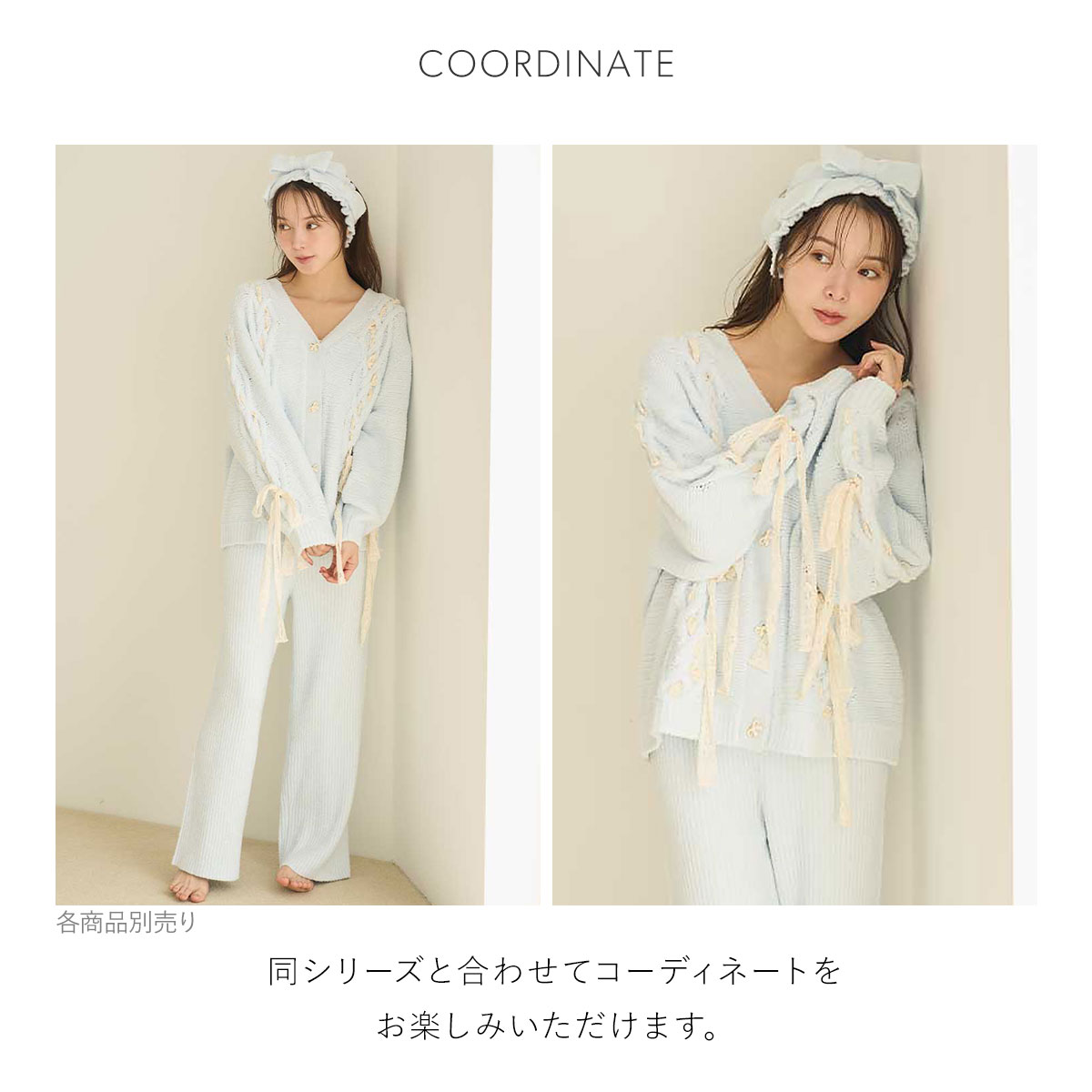 ボトムはウエストにレースリボンを添え、シンプルなストレートシルエットに。単体でもセットでもご着用いただけ、着こなしの幅が広がります。