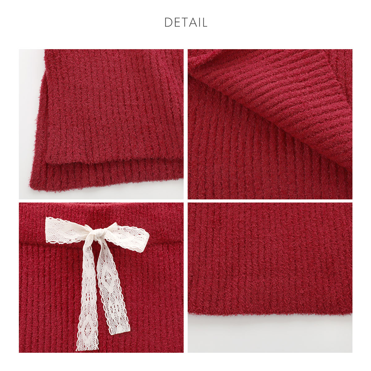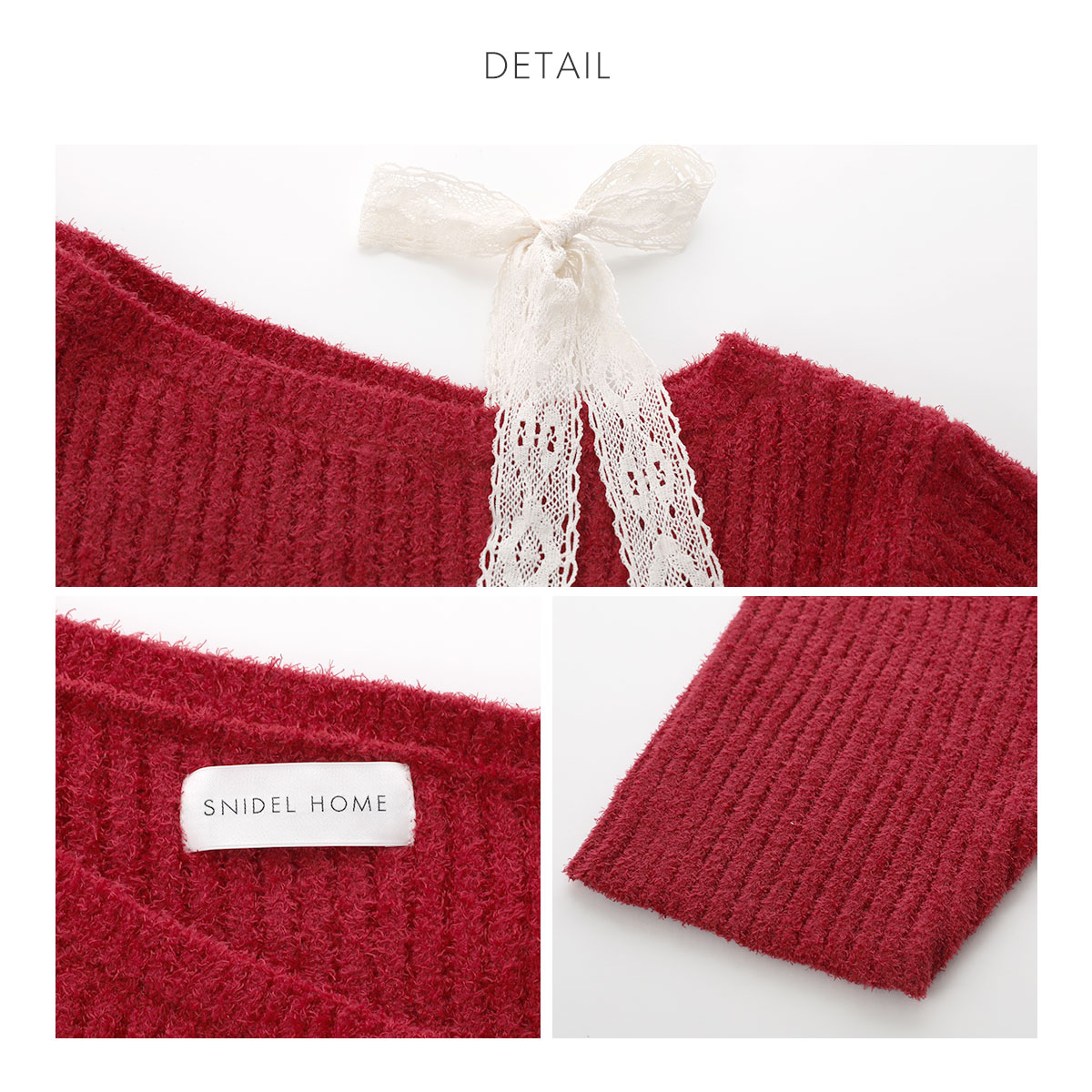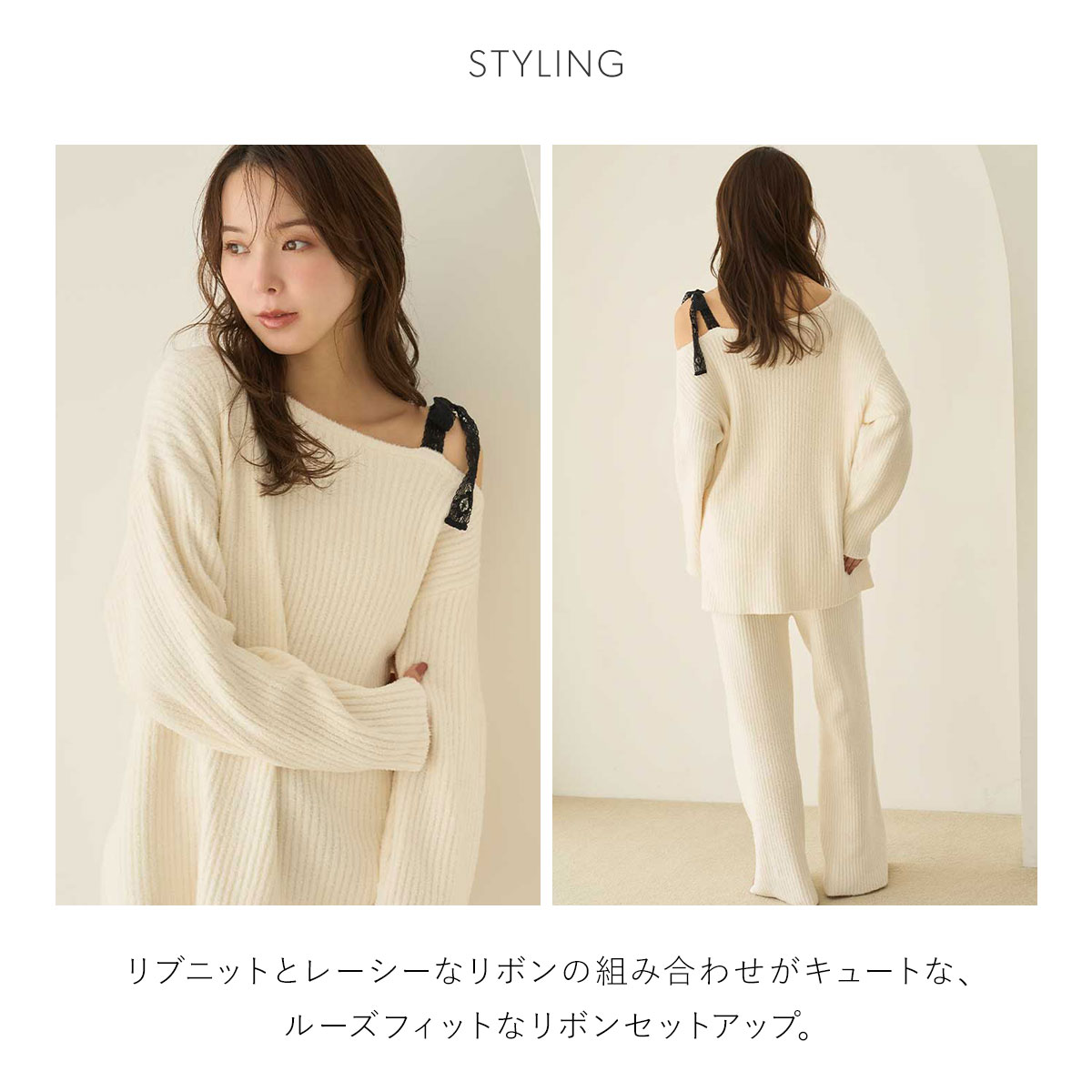 ざっくりしたリブニットとレーシーなリボンの組み合わせがキュートな、ルーズフィットなリボンセットアップ。