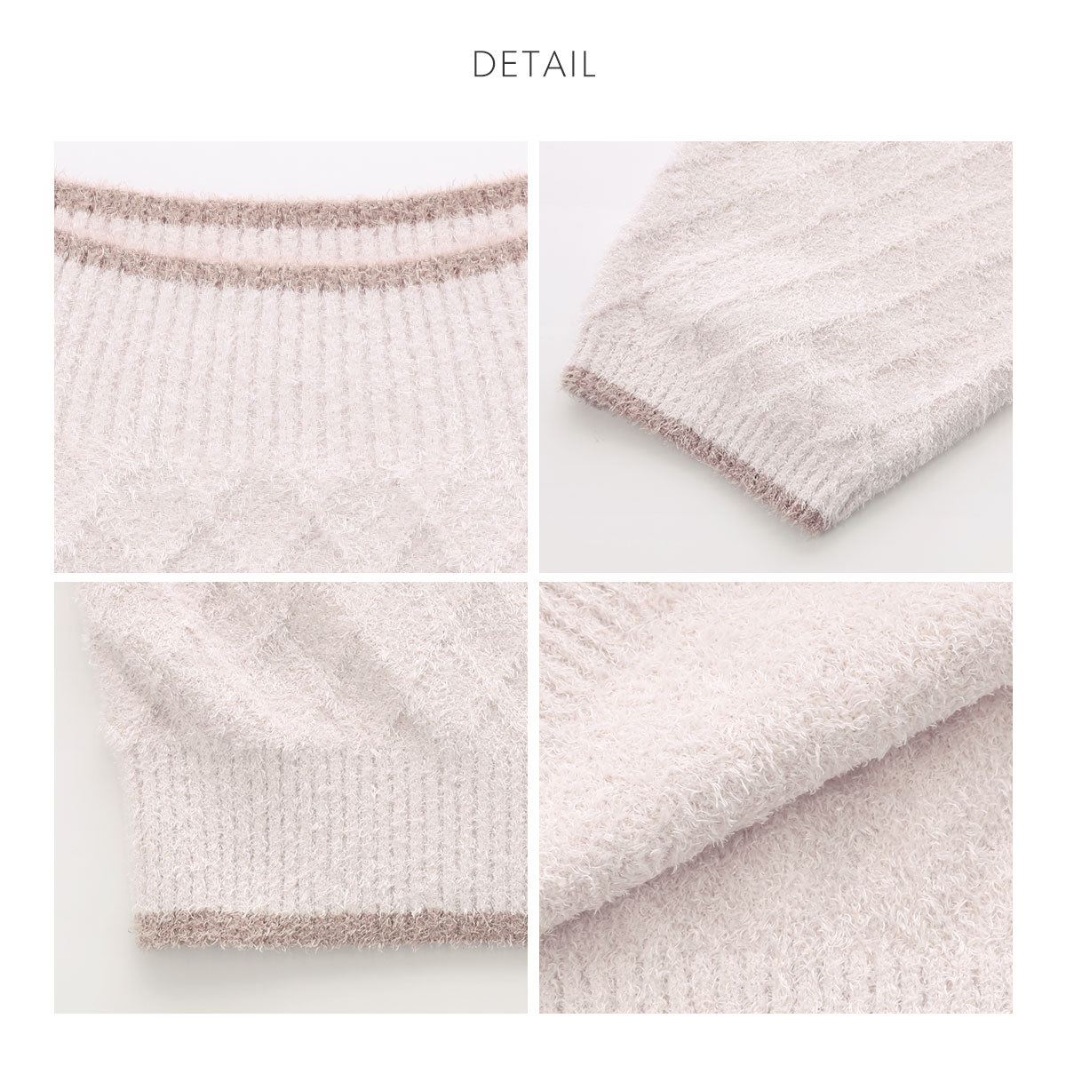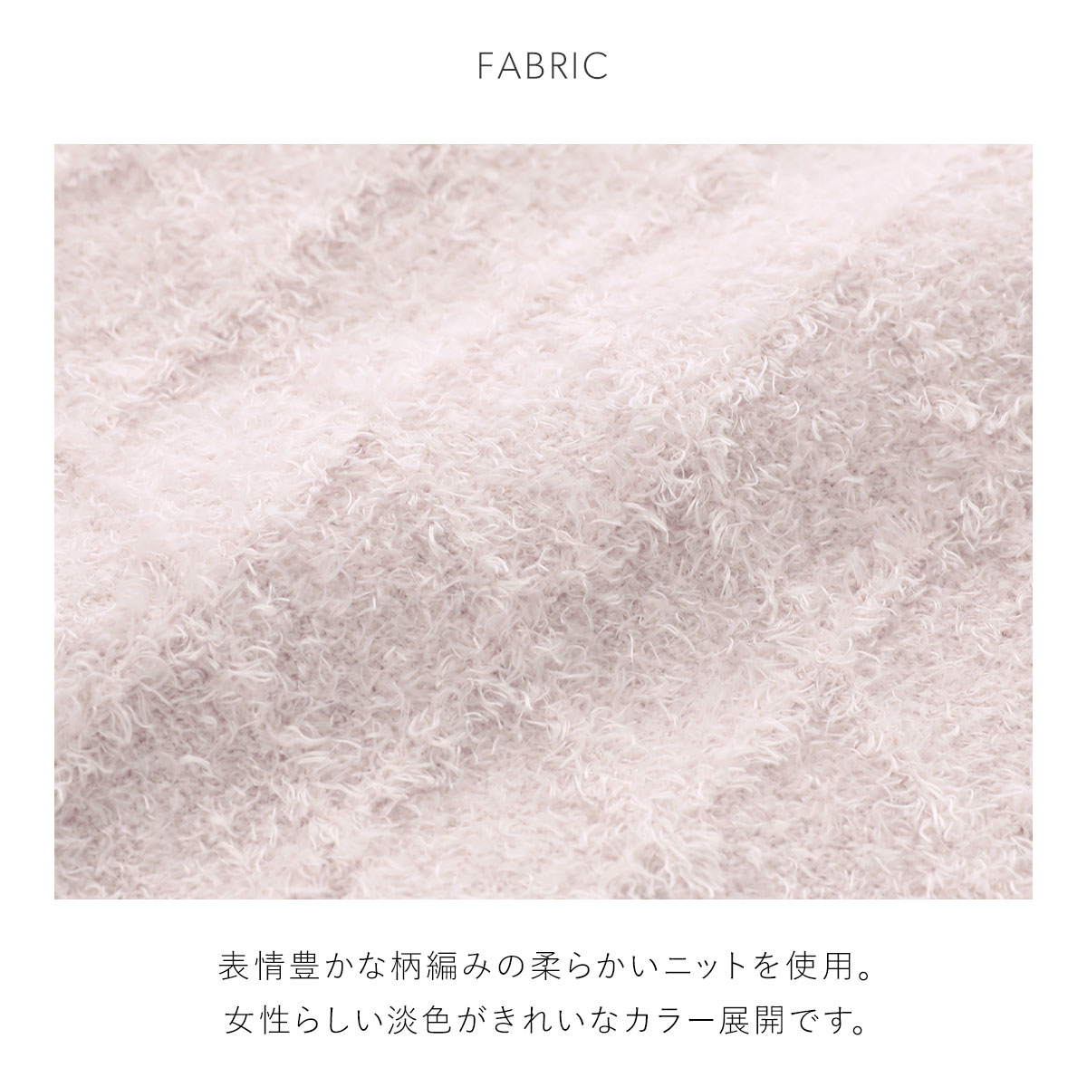 表情豊かな柄編みの柔らかいニットを使用した、女性らしいカラーリングのプルオーバー。