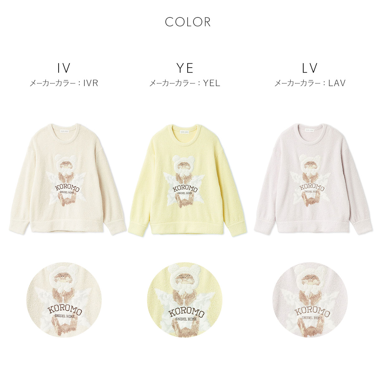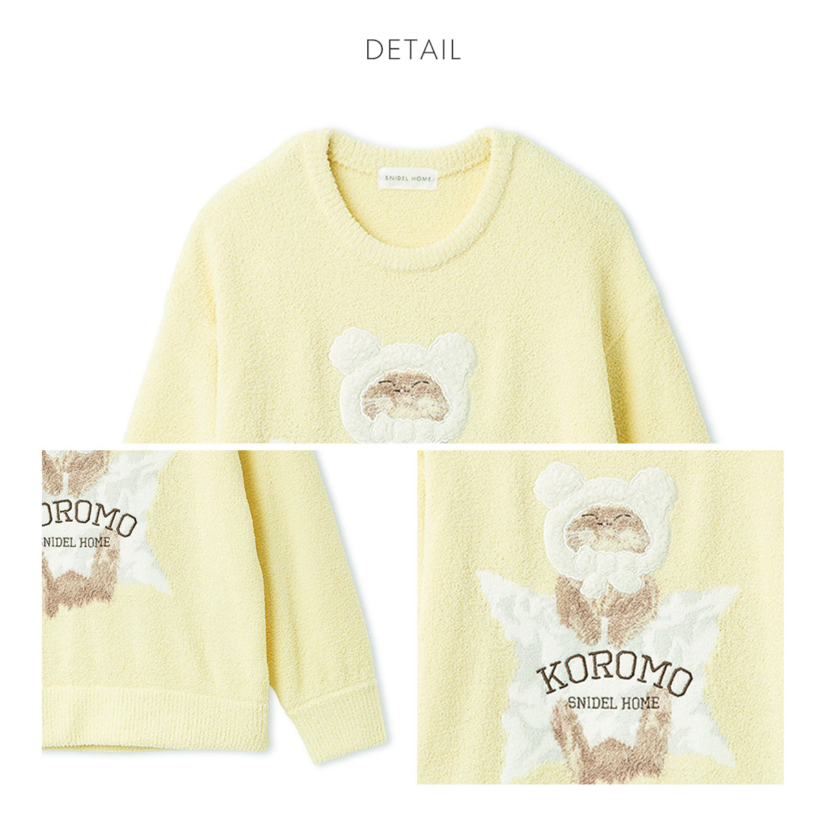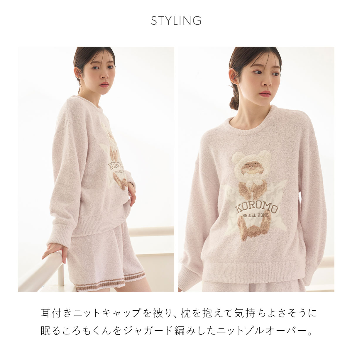 こちらは、耳付きニットキャップを被り、枕を抱えて気持ちよさそうに眠るころもくんをジャガード編みしたニットプルオーバー。