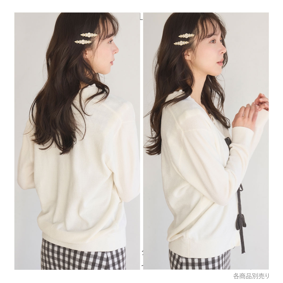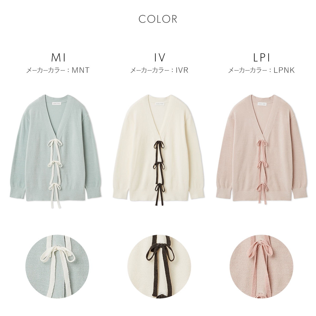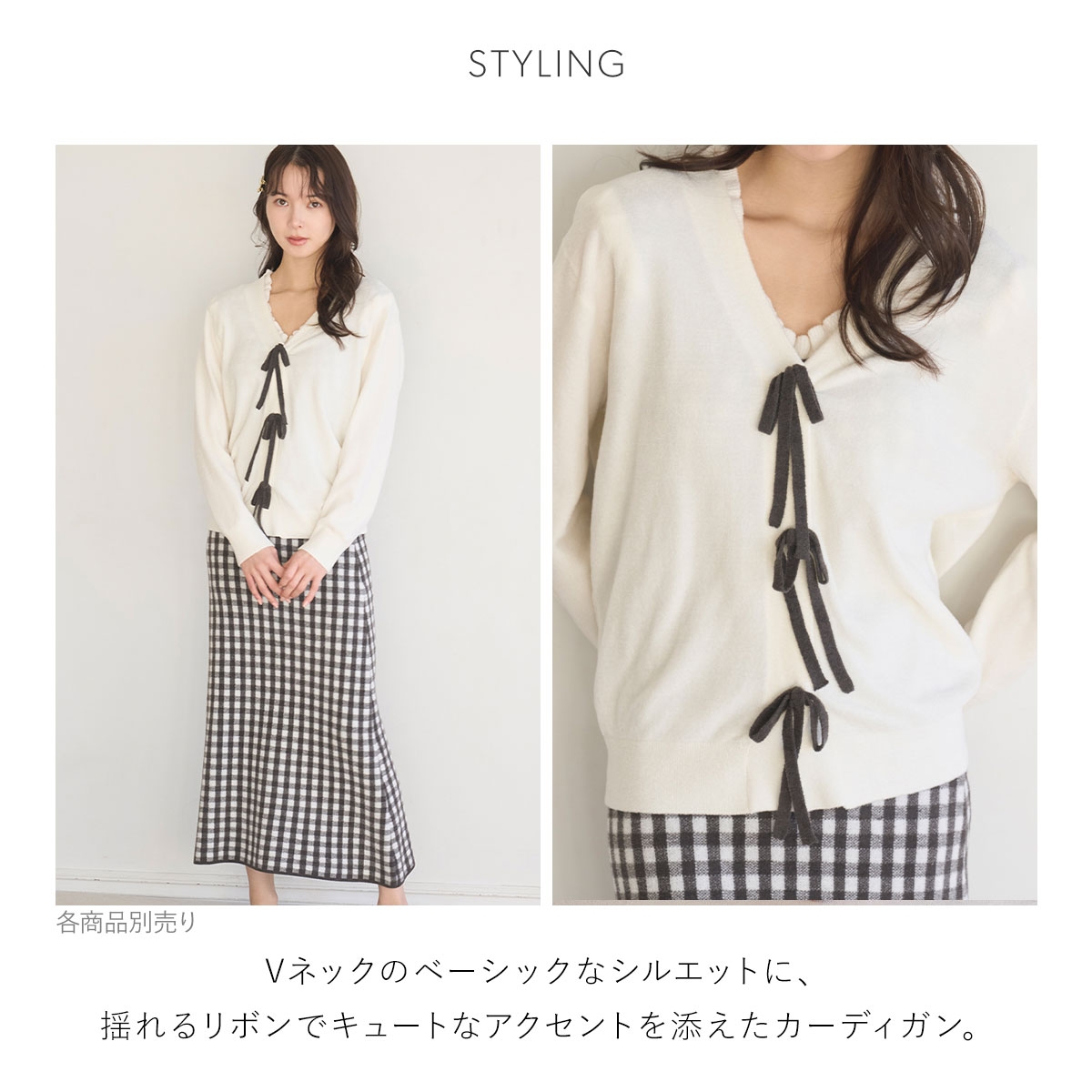 Vネックのベーシックなシルエットに、揺れるリボンでキュートなアクセントを添えたカーディガン。