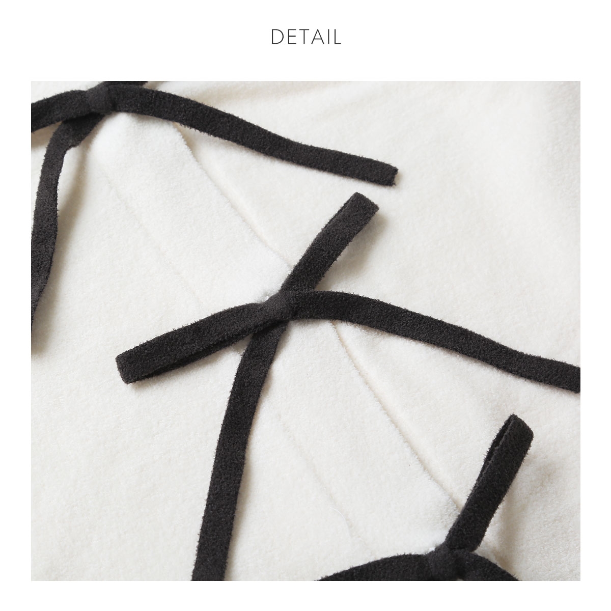 リボンの形は固定されているのでほどける心配がなく、ボタンは留め外しがしやすいスナップボタンを採用しています。