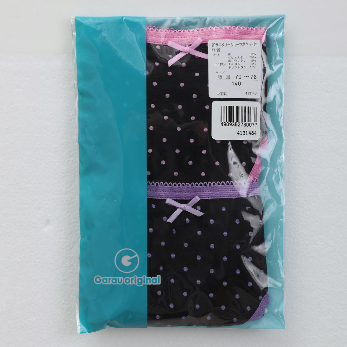 | 仕 様 | ・ジュニア用 ・サニタリー ・2wayに伸縮性あり ・クロッチ:付き、防水布 ・透感:なし ・ポケット付き ・股上:約11cm(※140サイズ置き寸法) ・股上:約12cm(※150サイズ置き寸法) ・股上:約13cm(※160サイズ置き寸法) ・股上:約13.5cm(※165サイズ置き寸法) |
