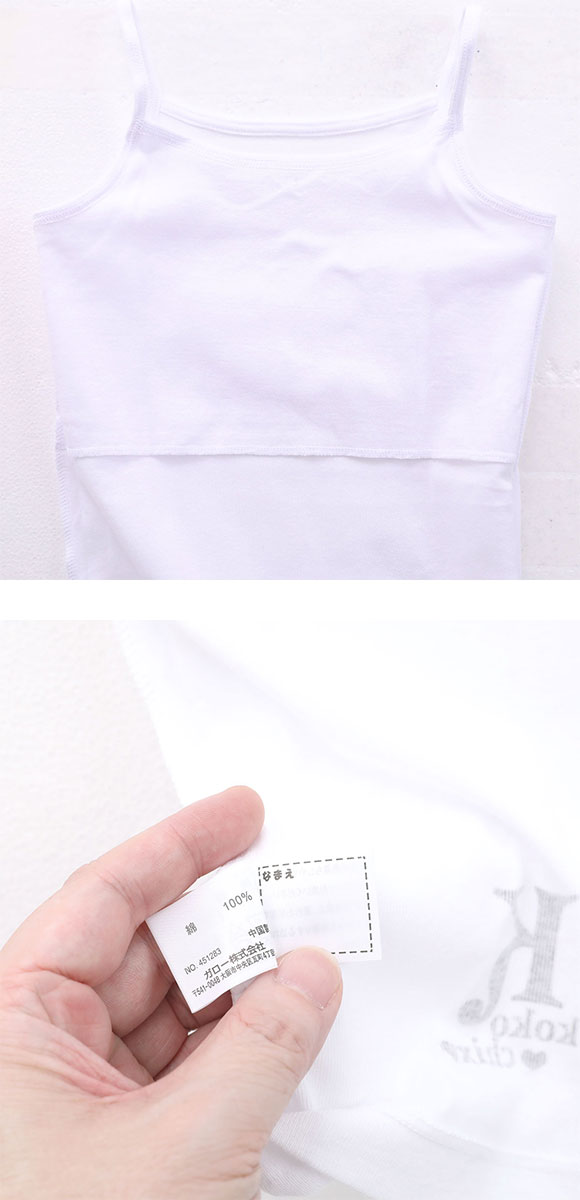| 仕 様 | ・2枚組 ・吸水速乾 ・内側にネームラベルつき ・胸元2重仕様 ・肩紐調整:不可 |