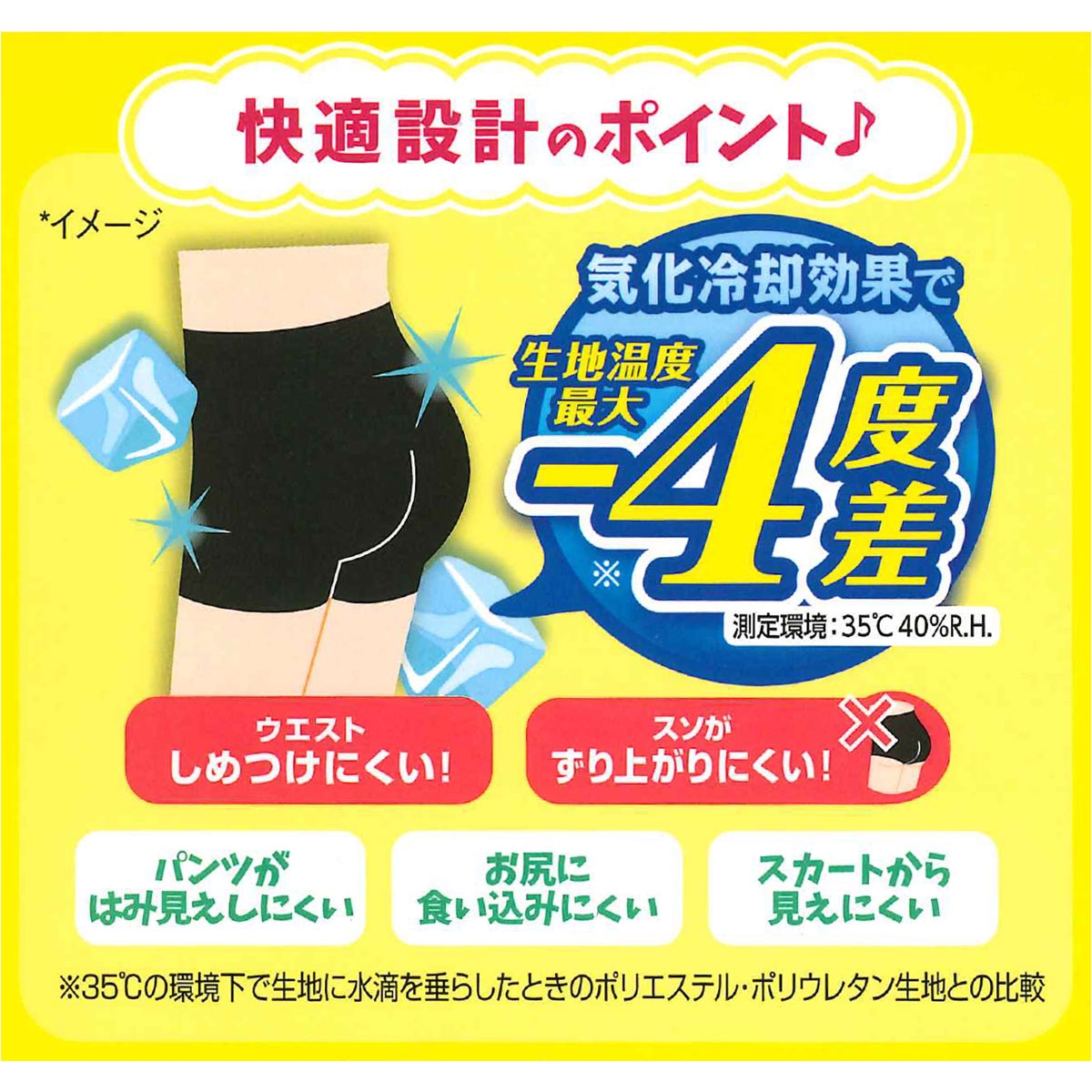 しめつけのやさしいウエストゴムを使用し、おなかがラクなはき心地。おしりにフィットする立体設計とオリジナルの股下長め設計で、おしりの食い込みやずり上がりをガードします。