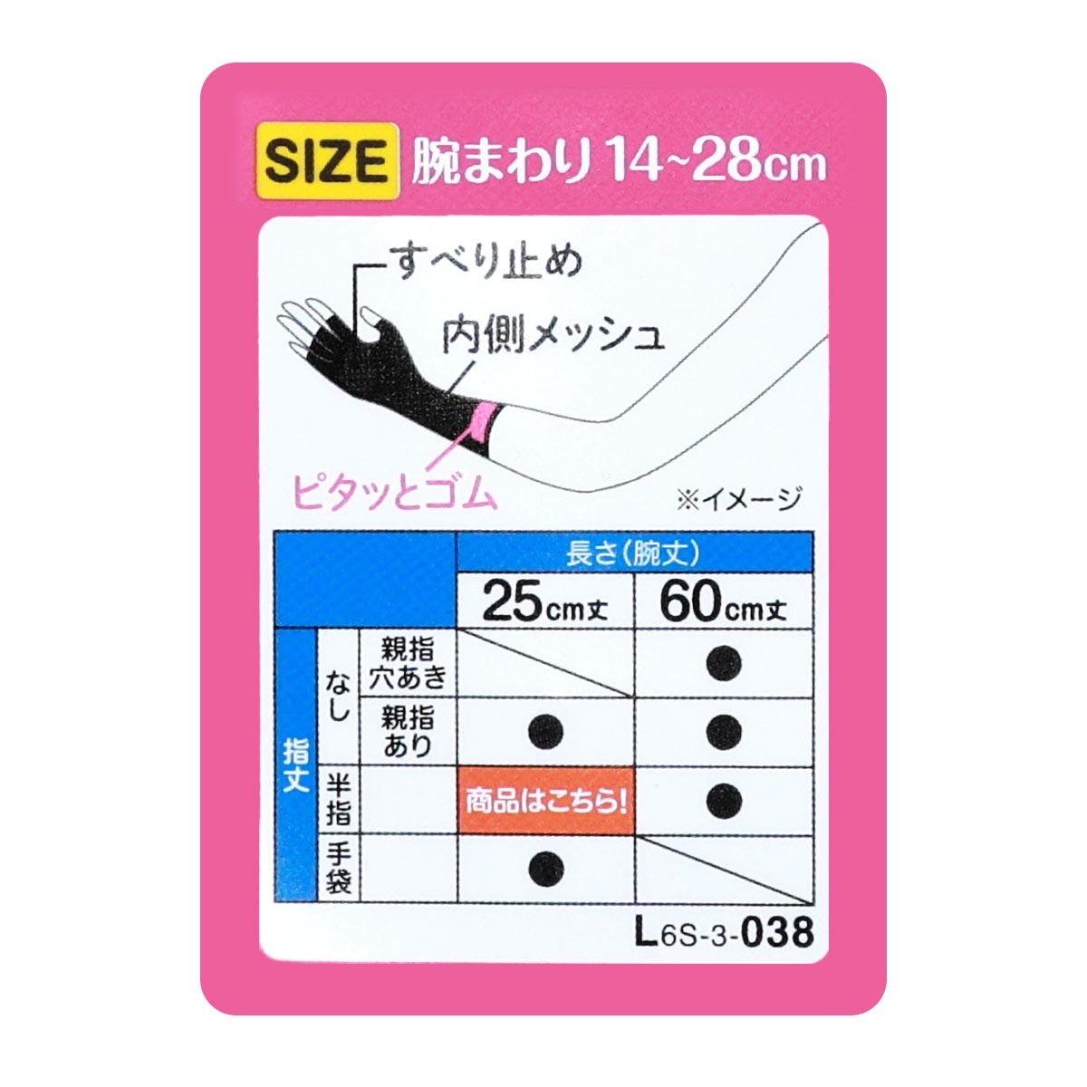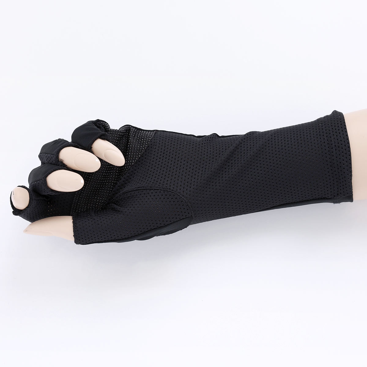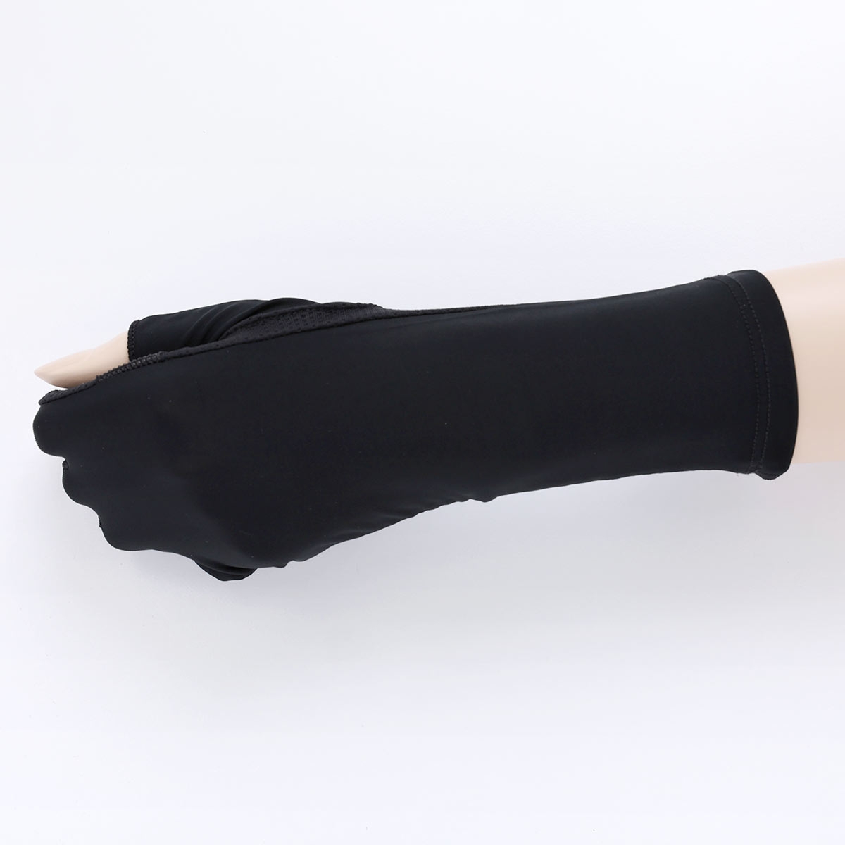 | 仕 様 | ・紫外線遮蔽率99%(※メッシュ部除く) ・ショート丈 ・指切りタイプ ・内側メッシュ生地 ・手のひらに滑り止め付き ・着用口にピタっとゴム入りでズレ落ちにくい設計 ・吸水速乾 ・冷感 |