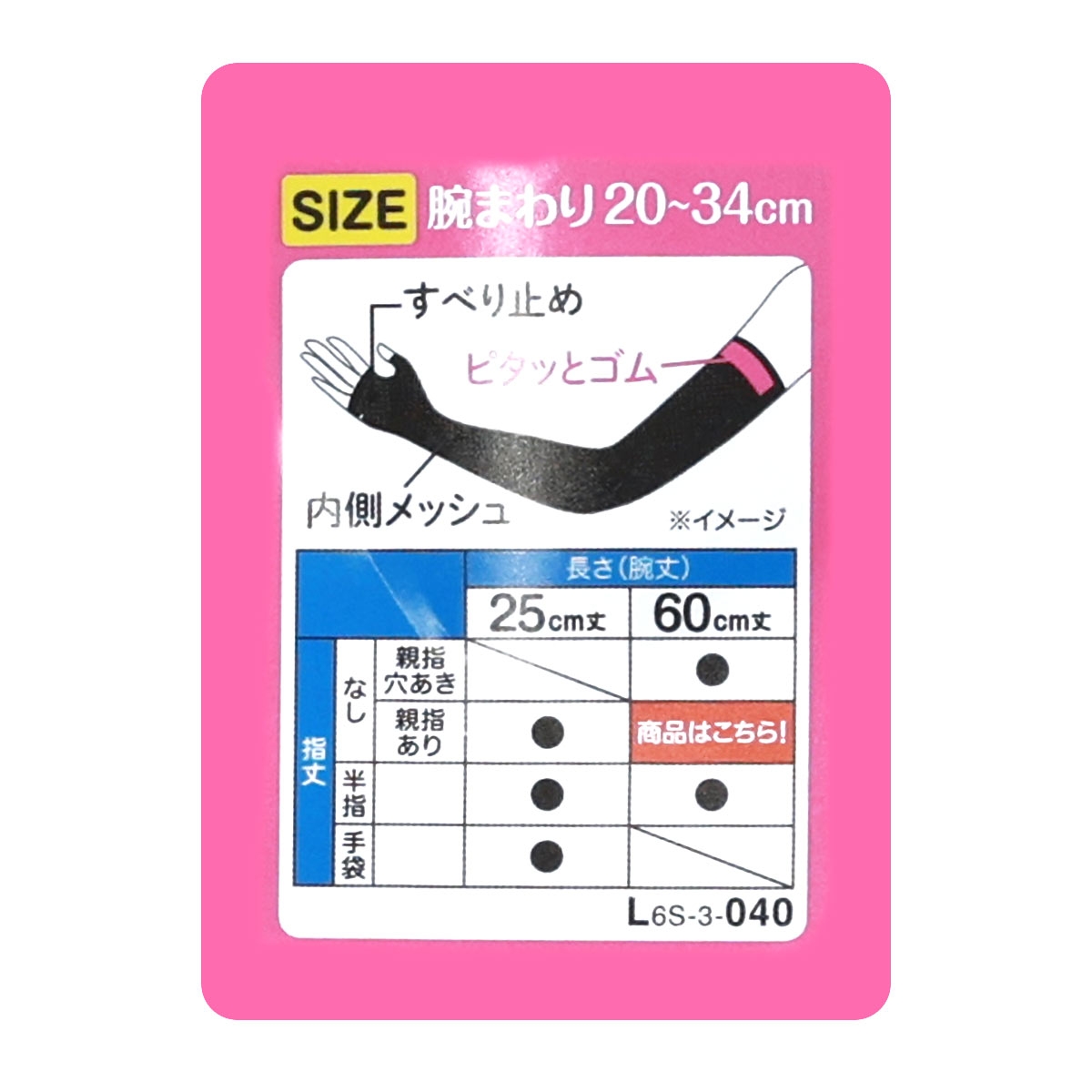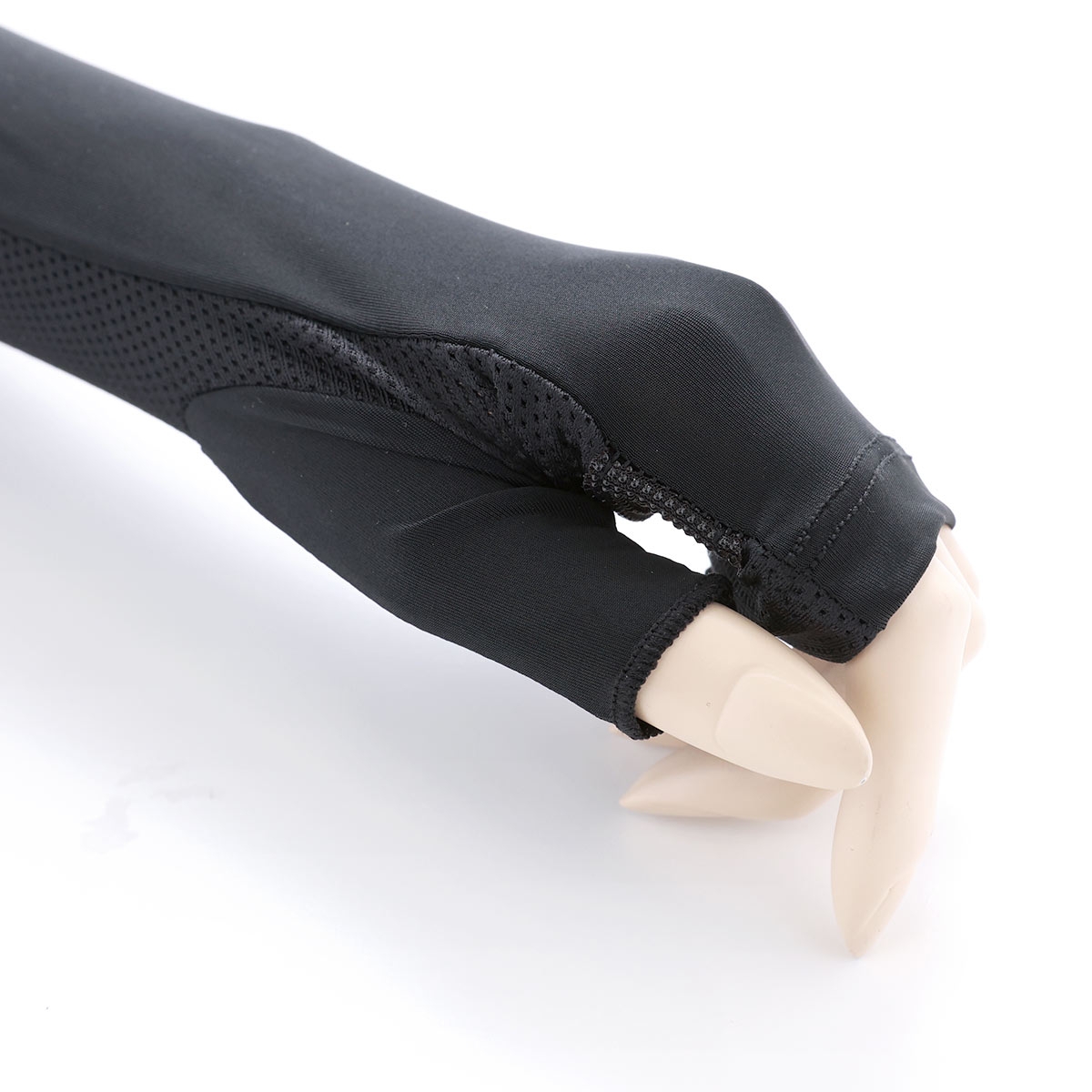 | 仕 様 | ・紫外線遮蔽率99%(※メッシュ部除く) ・ロング丈 ・オープンタイプ(親指あり) ・内側メッシュ生地 ・手のひらに滑り止め付き ・着用口にピタっとゴム入りでズレ落ちにくい設計 ・吸水速乾 ・冷感 |