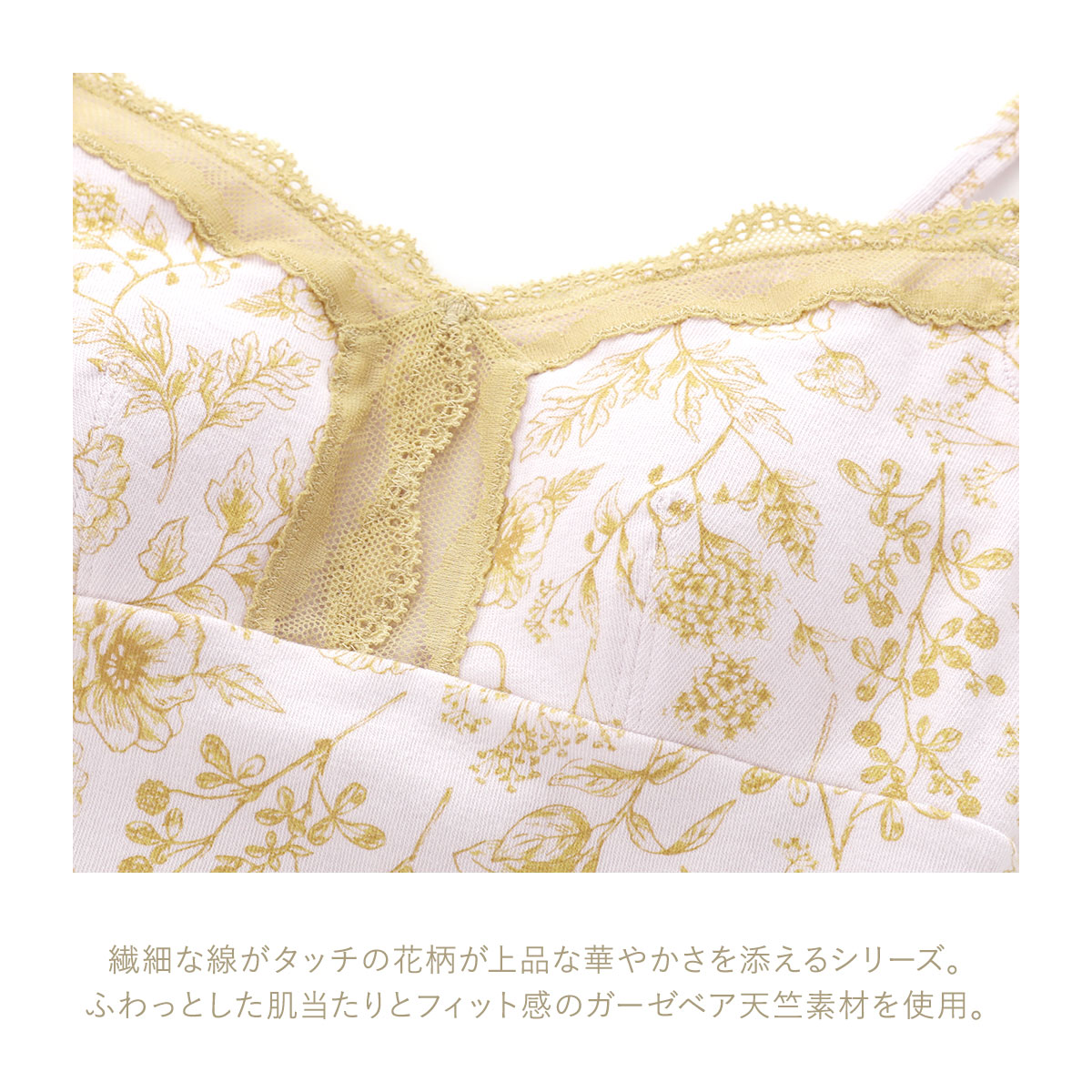 スケッチのような花々が美しい総柄で、切り替え部分のレースがアクセント。背中部分に裏地を使用していないため、ソフトな着用感で快適です。インナーとしても、リラックスウェアとしても活躍します。