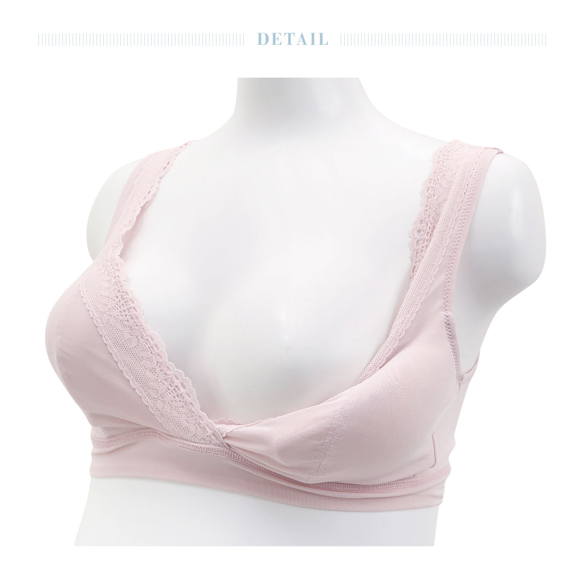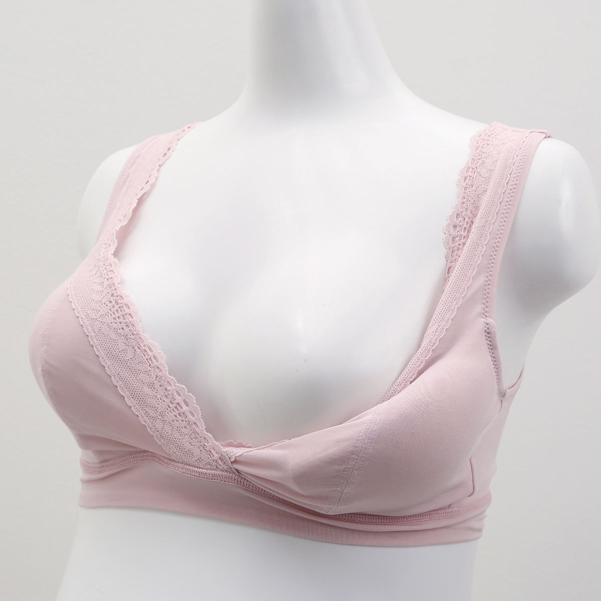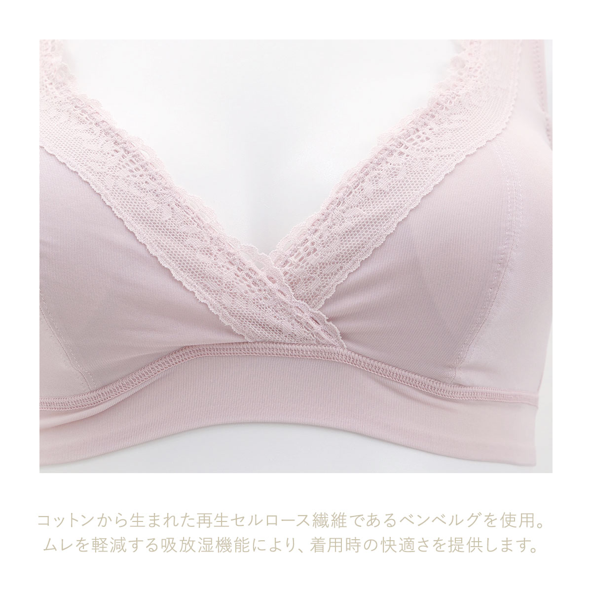 バストのフロント部分はカシュクールデザインを採用。妊娠期から産後まで、幅広い期間でご着用いただけます。大人っぽいダスティピンクと清潔感溢れるアイボリーの2色展開。体温の上がりやすい妊娠期にもベンベルグ素材はおすすめです。