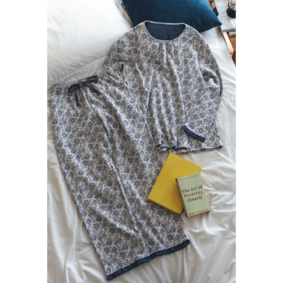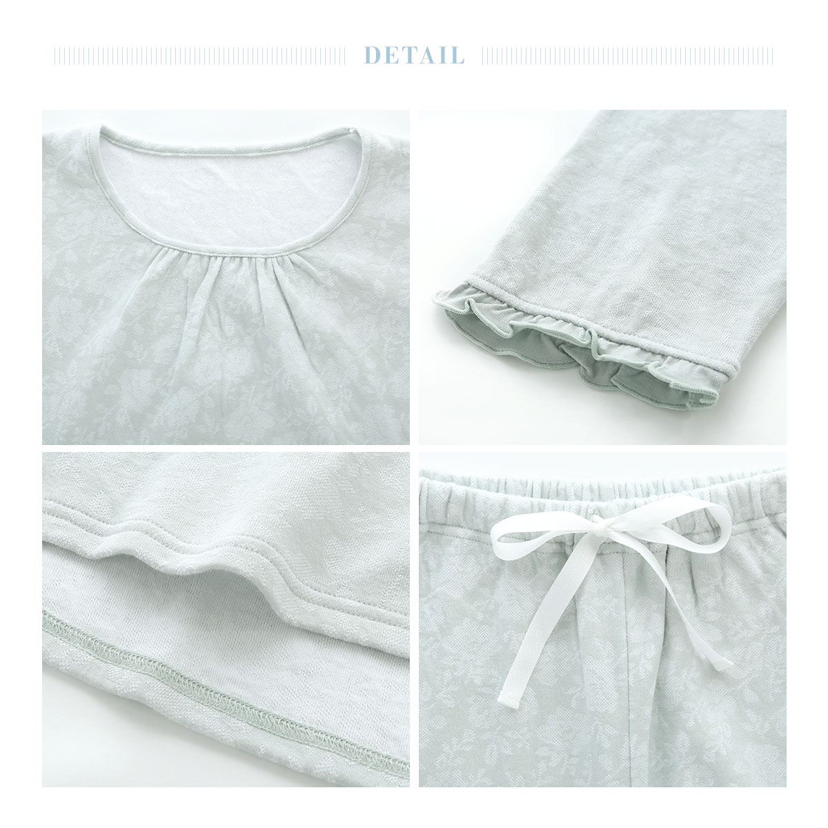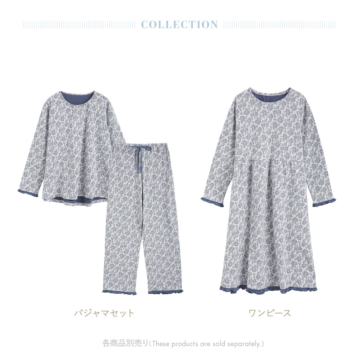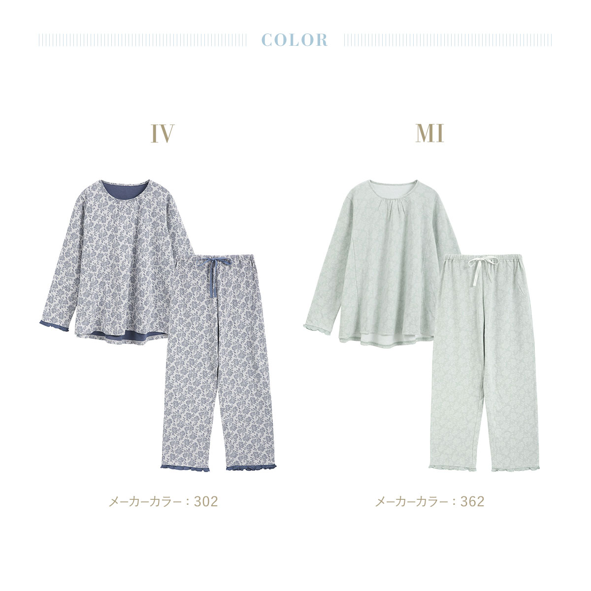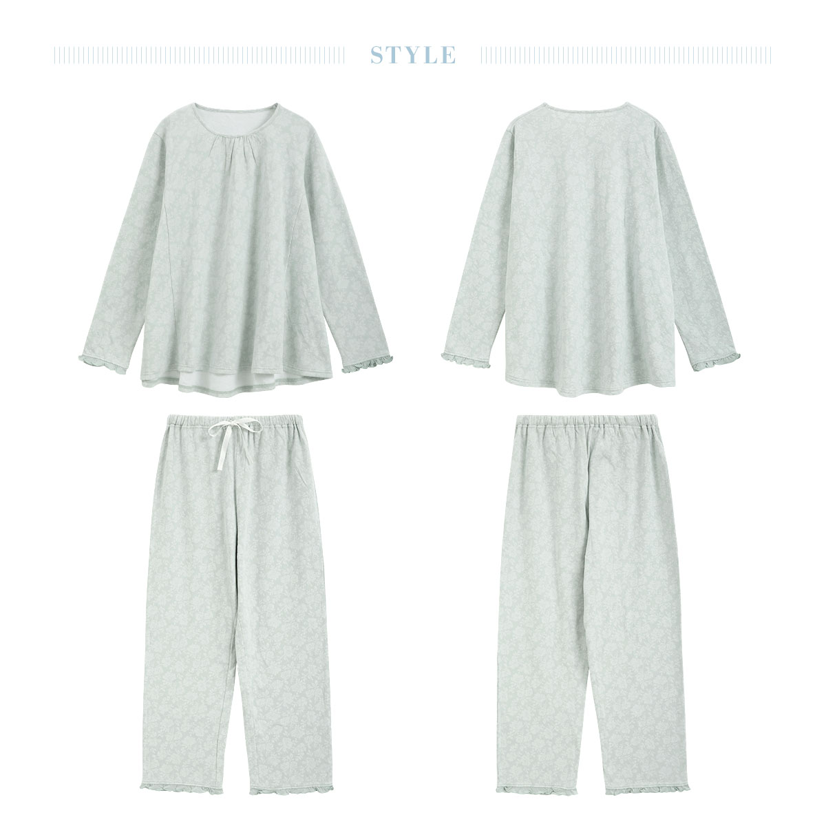 天竺フリルのアクセントが、落ち着いたデザインの中に華やかな印象をプラスします。長袖パジャマのトップスは、裾に向かって広がる可愛らしいフレアシルエット。前後の裾丈に差をつけ、おしゃれ感を演出しながらお腹周りもカバーします。ボトムスはストレートシルエットです。
