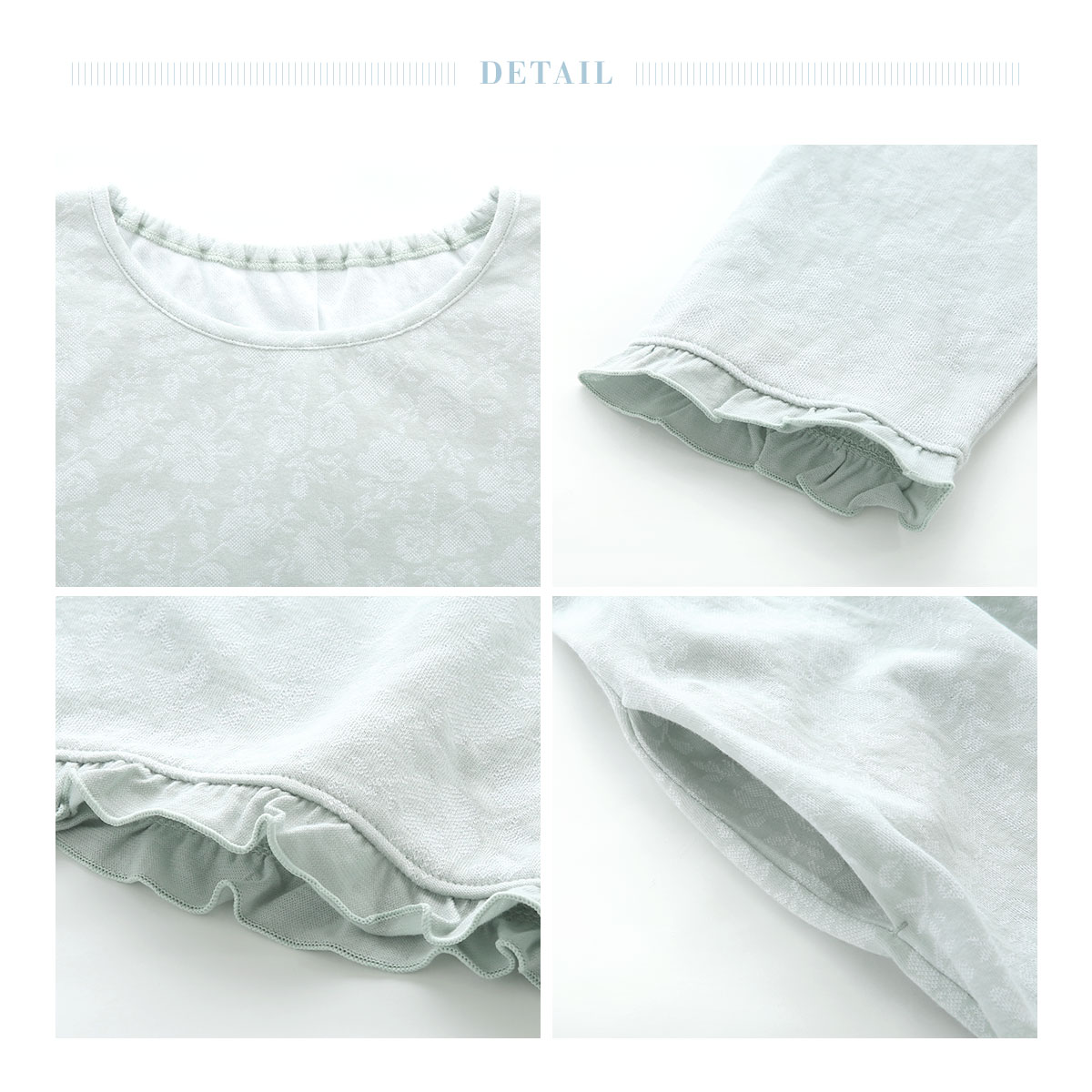 綿100%の天竺素材をジャガード織で繋ぎ合わせ、ふっくらとした厚みとやわらかさを実現。天竺フリルのアクセントで、落ち着いた中に華やかな印象を演出します。
