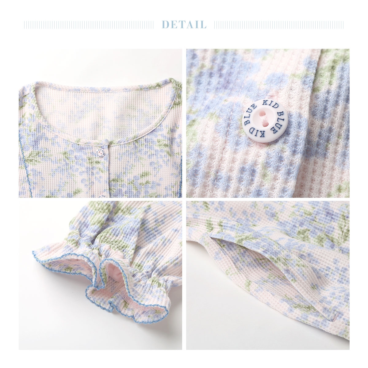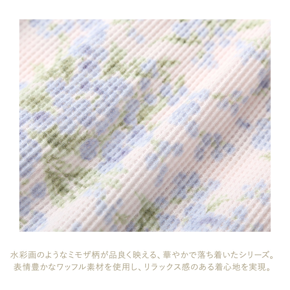表情豊かなワッフル素材を使用し、ナチュラルな風合いとリラックス感のある着心地を実現しました。大人に似合う、華やかで落ち着いたフラワープリントに仕上げています。