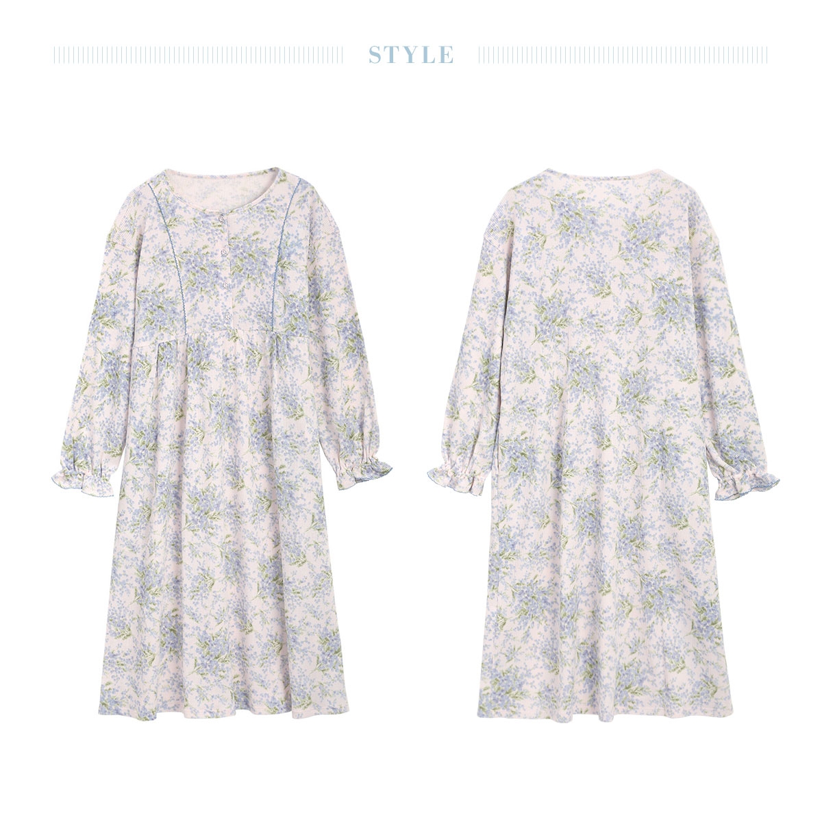 デザインは、ギャザー切り替えや袖口のギャザーが可愛らしいワンピース。端に施したピコット刺繍が繊細なアクセントを添えます。袖口はゴム仕様でスムーズに腕まくりができ、家事などの実用性もしっかり兼ね備えた1枚です。