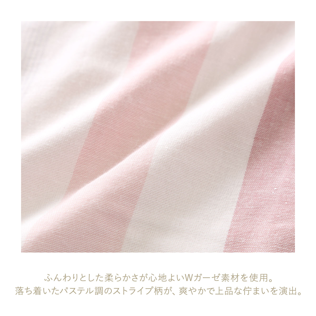 椿オイル加工を施し、肌に優しいなめらかな肌触りに仕上げました。落ち着いたパステル調のストライプ柄が、爽やかで上品な佇まいを演出します。