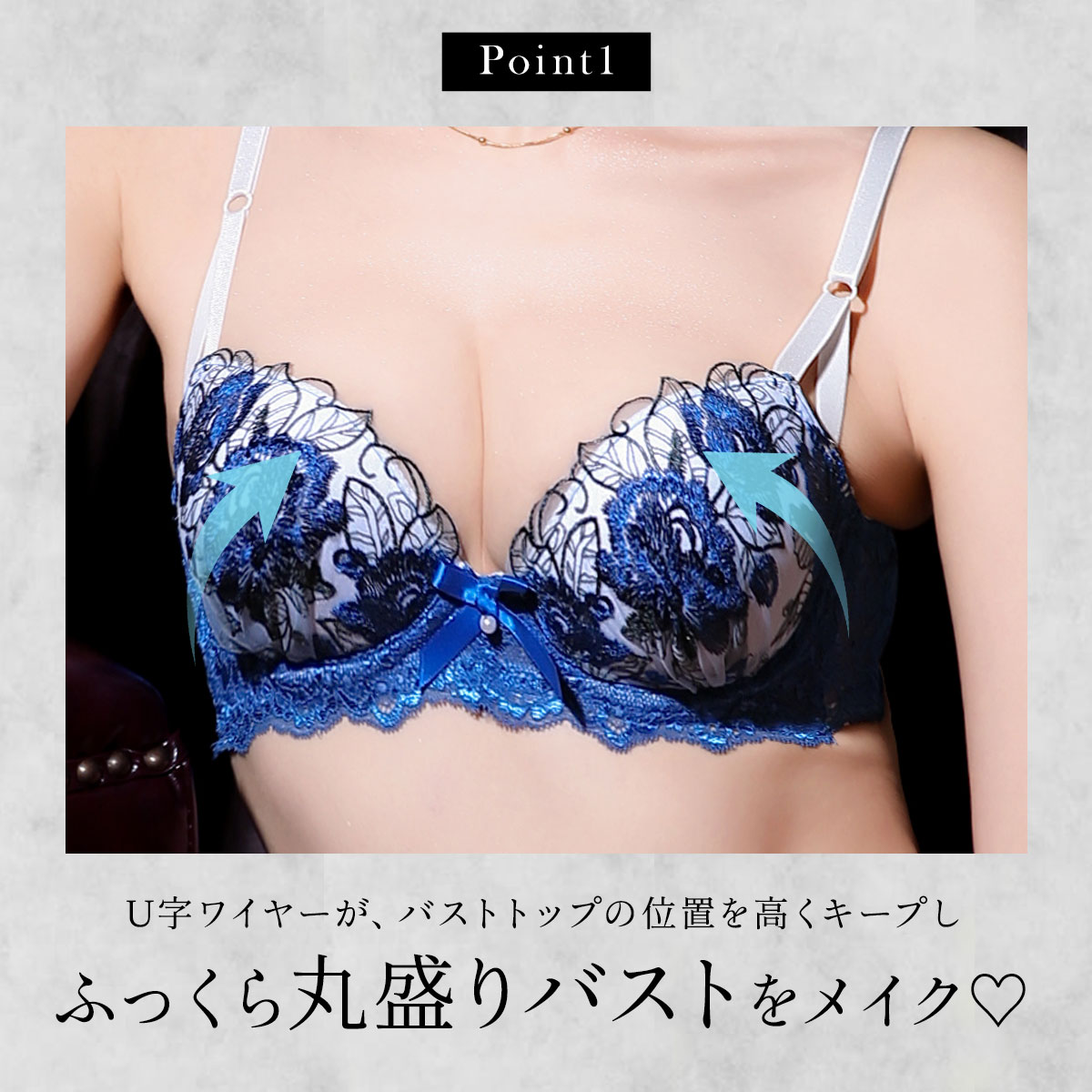 ブラは丸みのきれいなもっちり下厚の内蔵モールドカップ仕様。バストをほどよく寄せて下から持ち上げるU字ワイヤーが、バストトップの位置を高くキープし、デコルテにふっくら感のある丸盛りバストをメイクします。