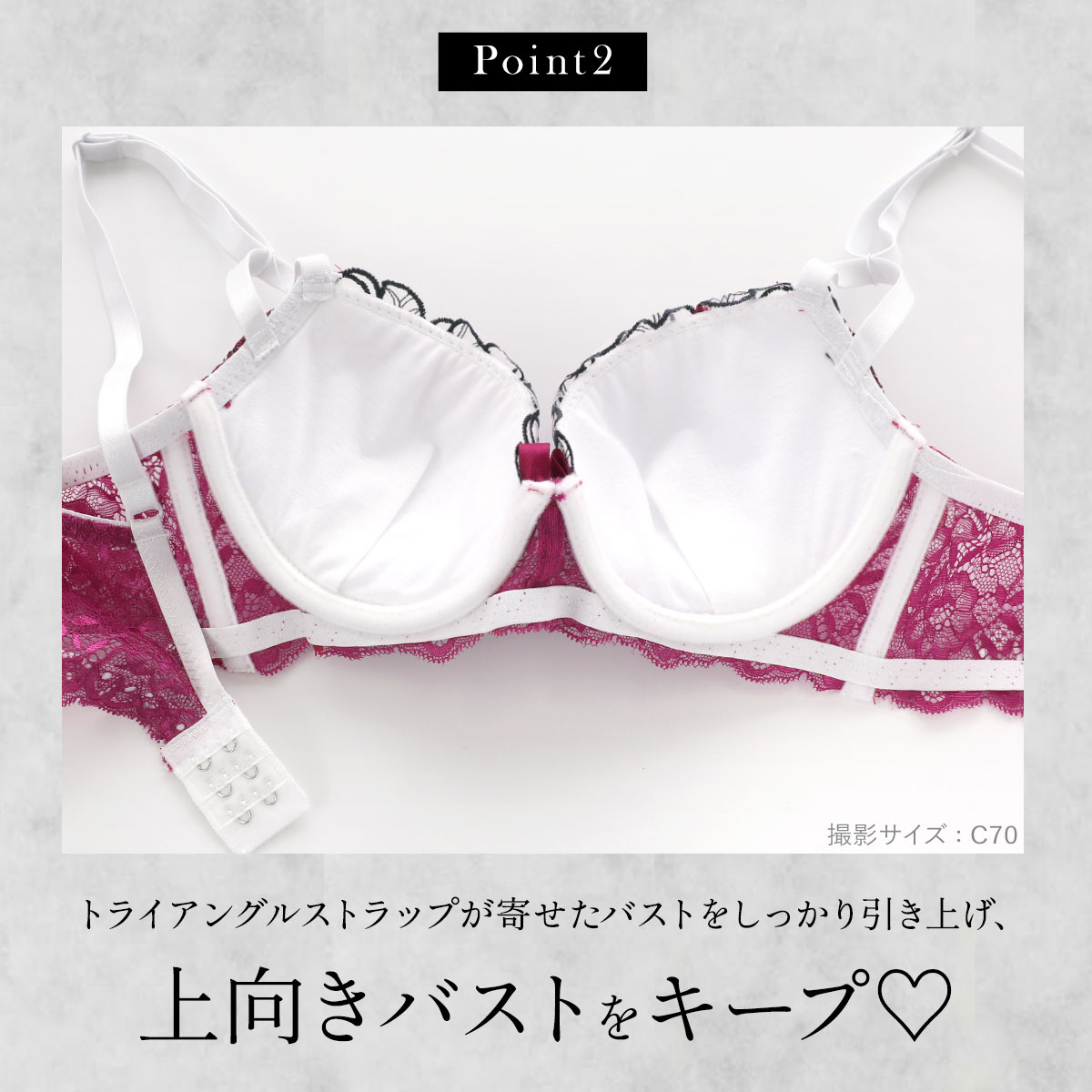 脇高設計で気になる脇肉もしっかりキャッチ。さらに、カップ直結のトライアングルストラップが寄せたバストボリュームをしっかり引き上げるので上向きバストをキープ☆