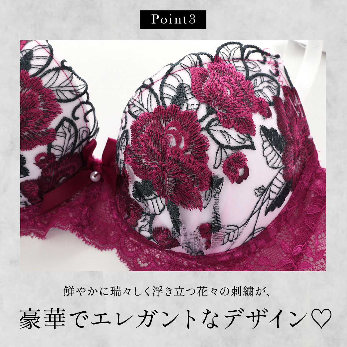 鮮やかに瑞々しく浮き立つ花々が刺繍された豪華でエレガントなデザイン。胸中心にはサテンリボンとパールビーズがあしらわれ、品のあるアクセントに。