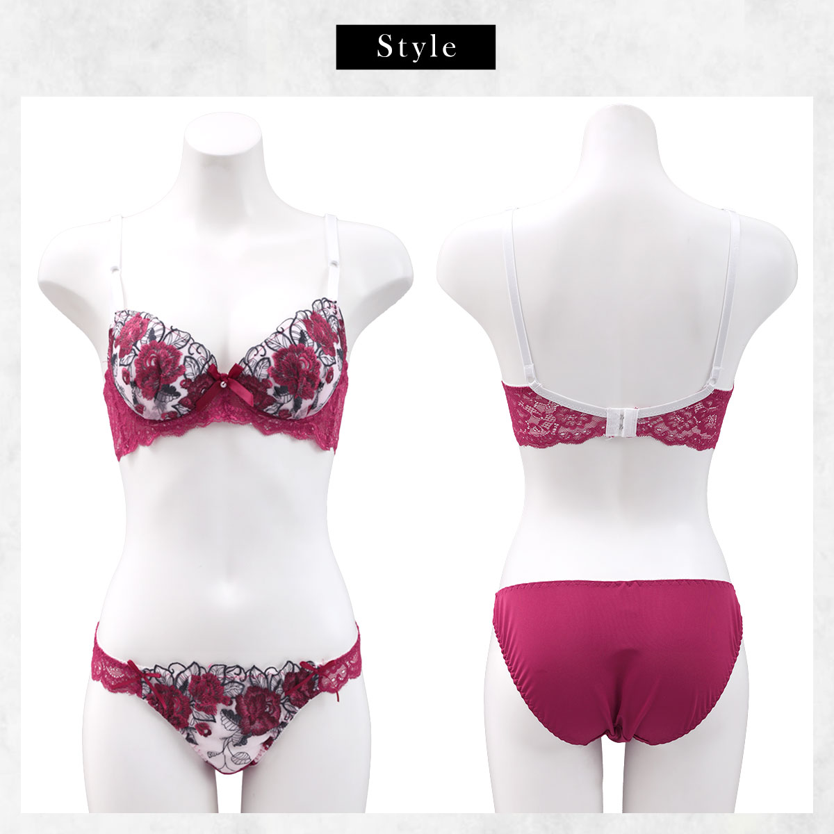 | 仕 様 | ブラ ・脇高設計 ・ホックの数:2段3列 ・3/4カップ ・下厚内蔵パッドあり、パッドポケットなし ・肩紐取外し:不可(トライアングルストラップ) ・ワイヤー入り ・サイドボーン:あり