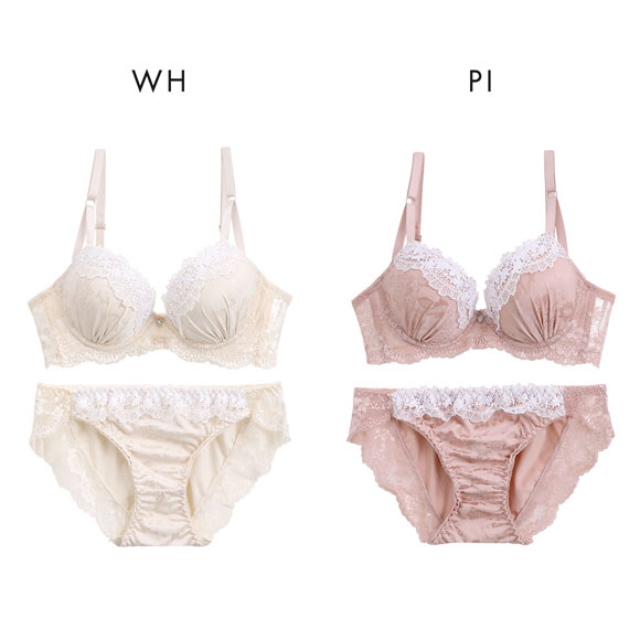 なめらかシルキーなフラワージャガードサテンにオーロラ糸のきらめくケミカルレースを重ねた清楚で上品なブラセット。