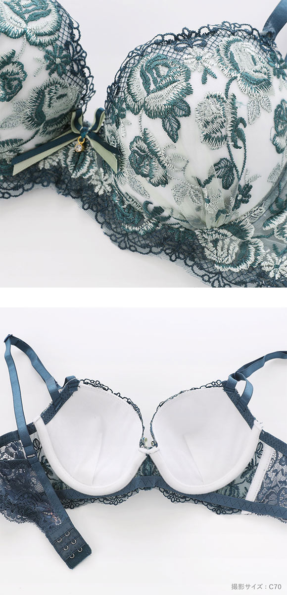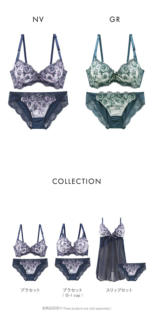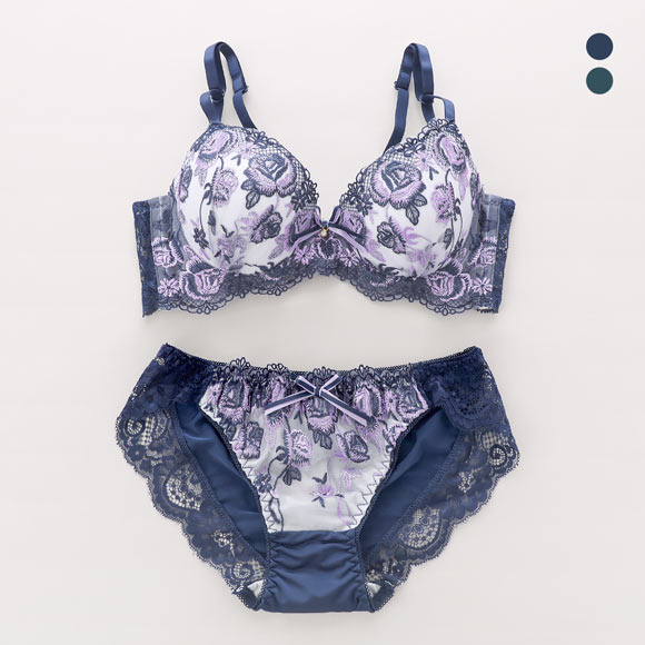鮮やかで統一感のあるバイカラーのローズ刺繍がエレガントな雰囲気のブラセット。胸中心には刺繍糸と色を合わせたダブルリボンとジュエルチャームをあしらい、愛らしい華やかさをプラス。