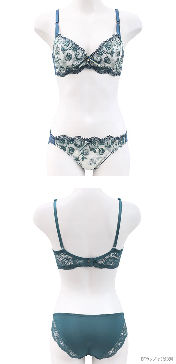 | 仕 様 | ブラ ・脇高設計 ・ホックの数:3段3列 ・3/4カップ ・下厚内蔵パッドあり、パッドポケットなし ・肩紐取外し:不可 ・ワイヤー入り ・サイドボーン:あり