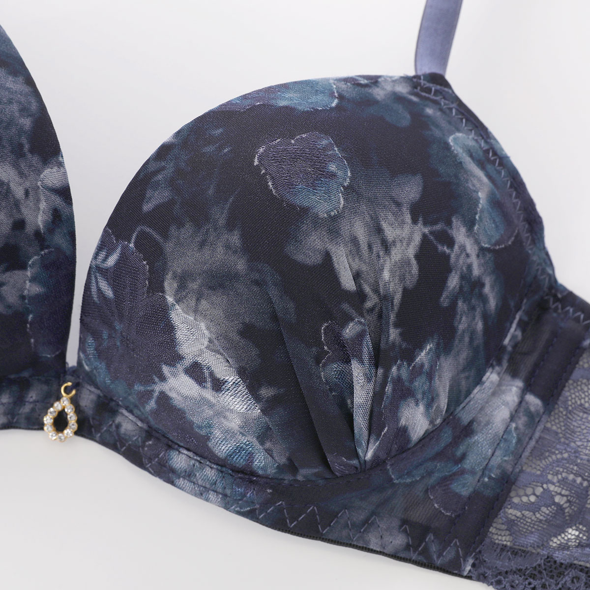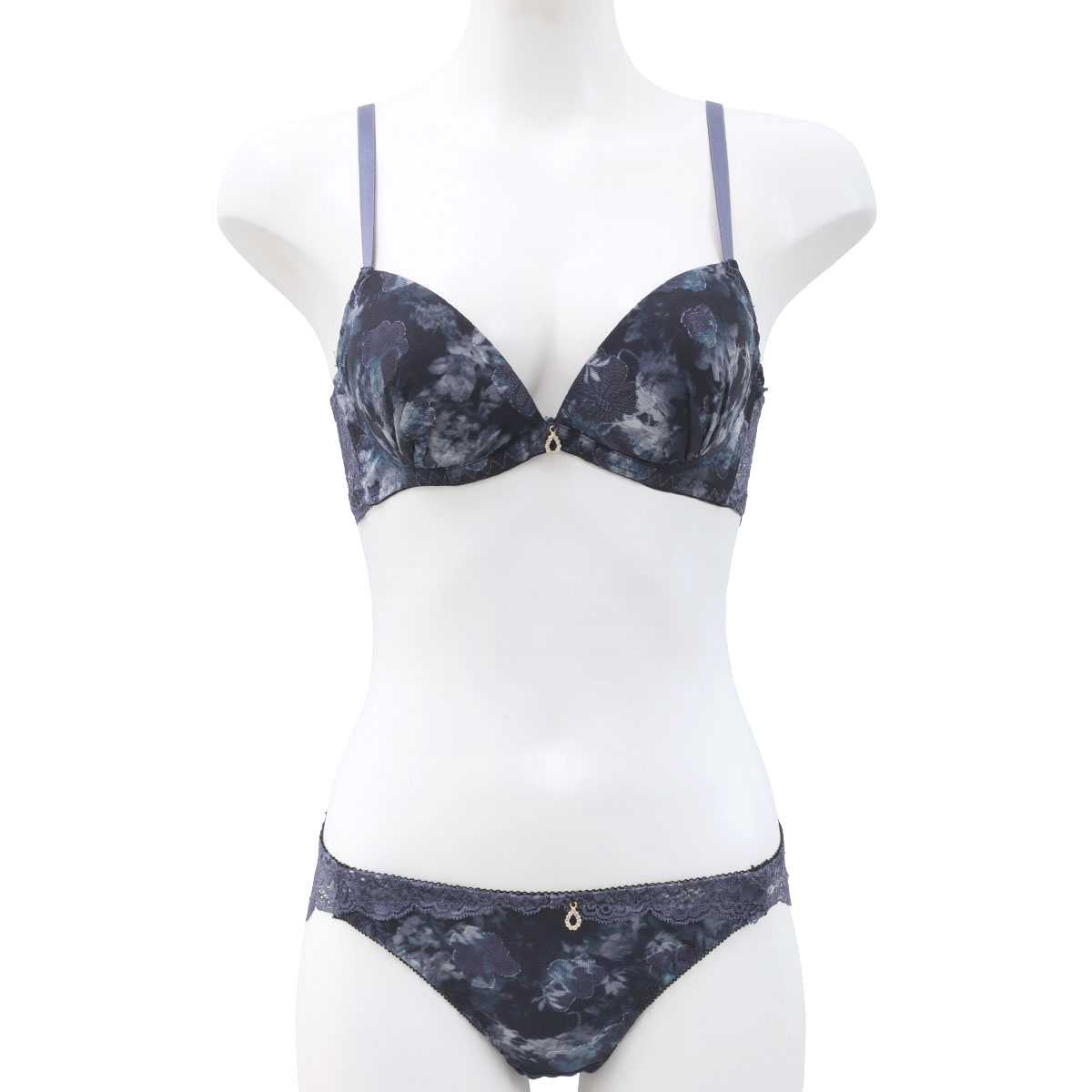 フラワージャガードのマットなシフォンにフォギーなフラワープリントをのせた、モードで大人なブラセット。胸中心のジュエルチャームが華やかなエッセンスをプラス。