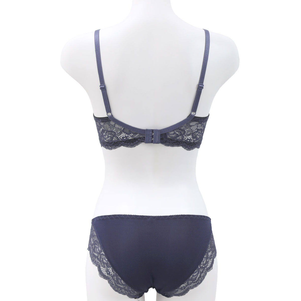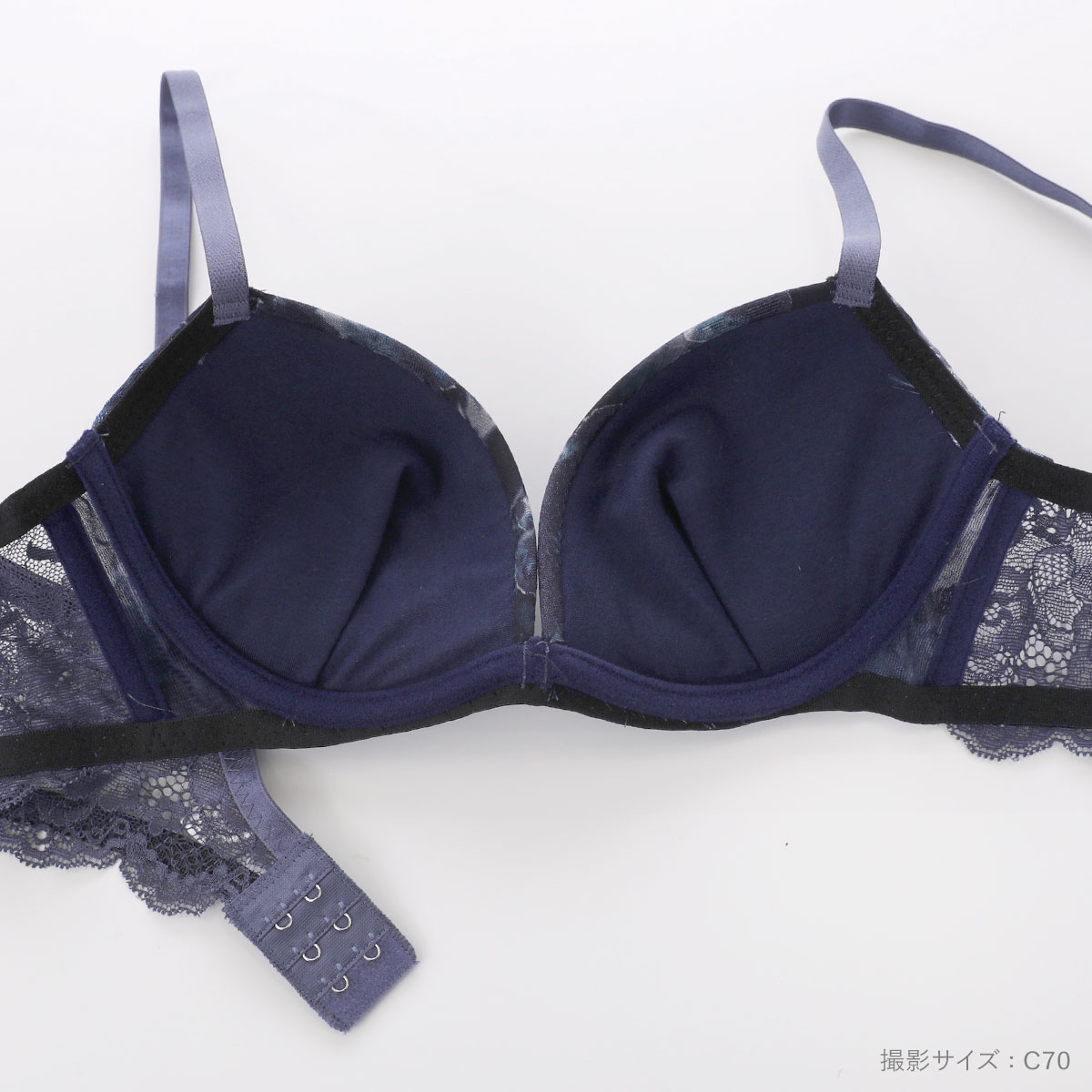 ブラは丸みのきれいなもっちり下厚の内蔵モールドカップ仕様。バストを中心に集めてキープしやすいL字ワイヤーがバストボリュームをほどよく寄せて、ナチュラルなバストラインをメイクします。